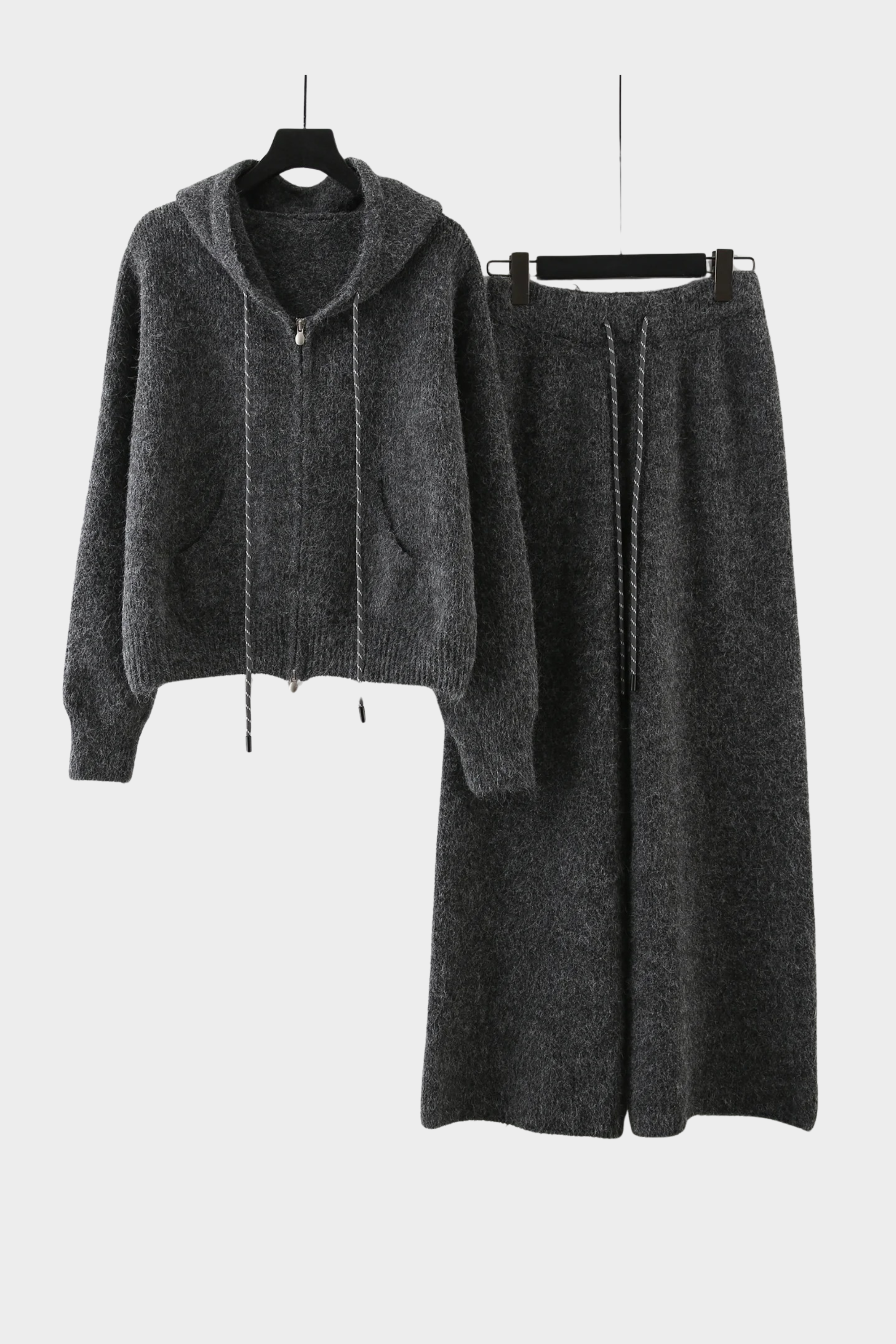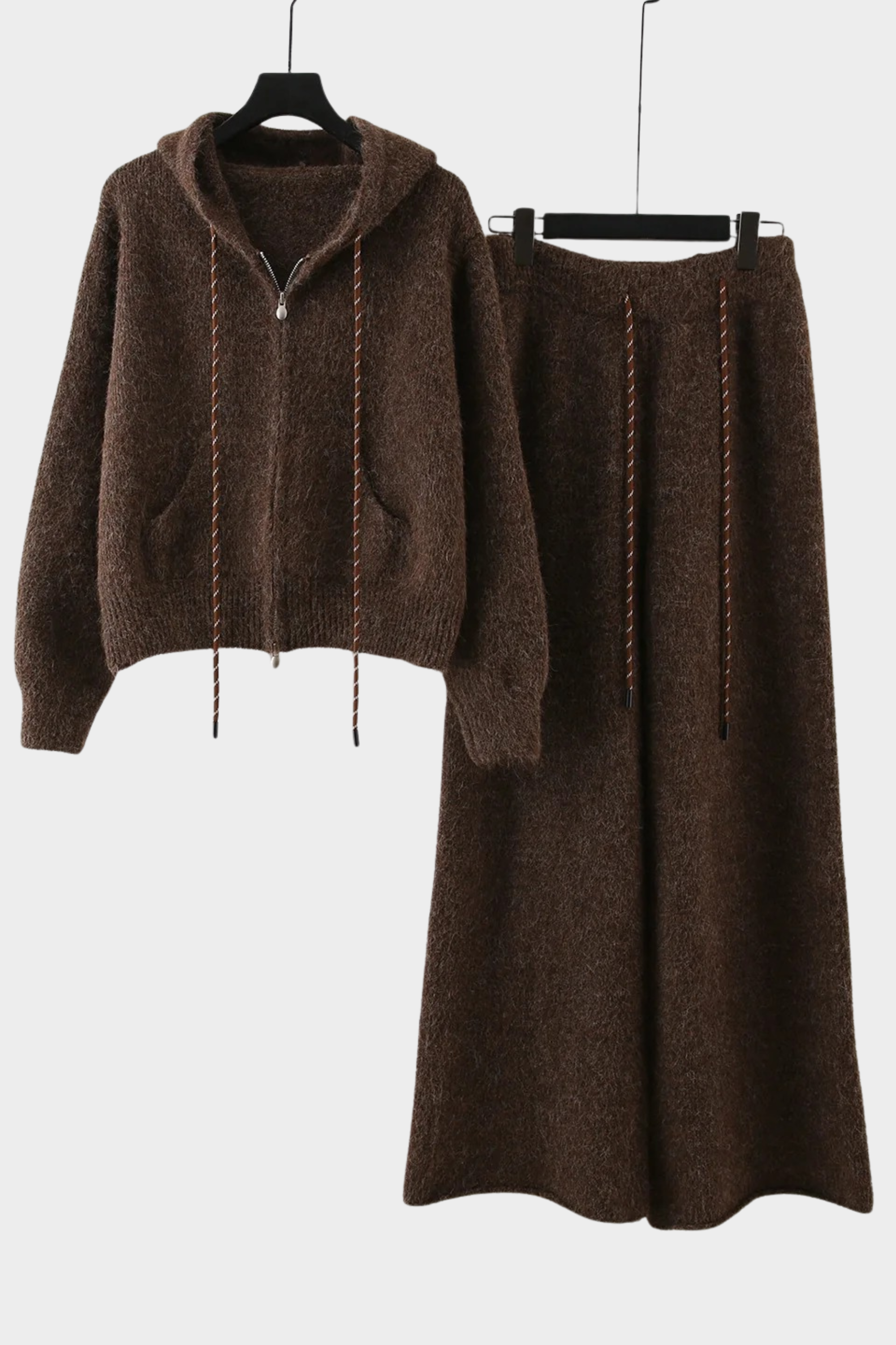 Wrap yourself in comfort with this ultra-soft fuzzy knit two-piece loungewear set. Designed for cozy days, this matching hoodie and wide-leg pants offer a relaxed yet flattering fit that feels warm, lightweight, and luxurious on the skin. The zip-up hoodie features a comfy hood, long sleeves, and front pockets, while the pants include a stretchy waistband with an adjustable drawstring for the perfect fit.