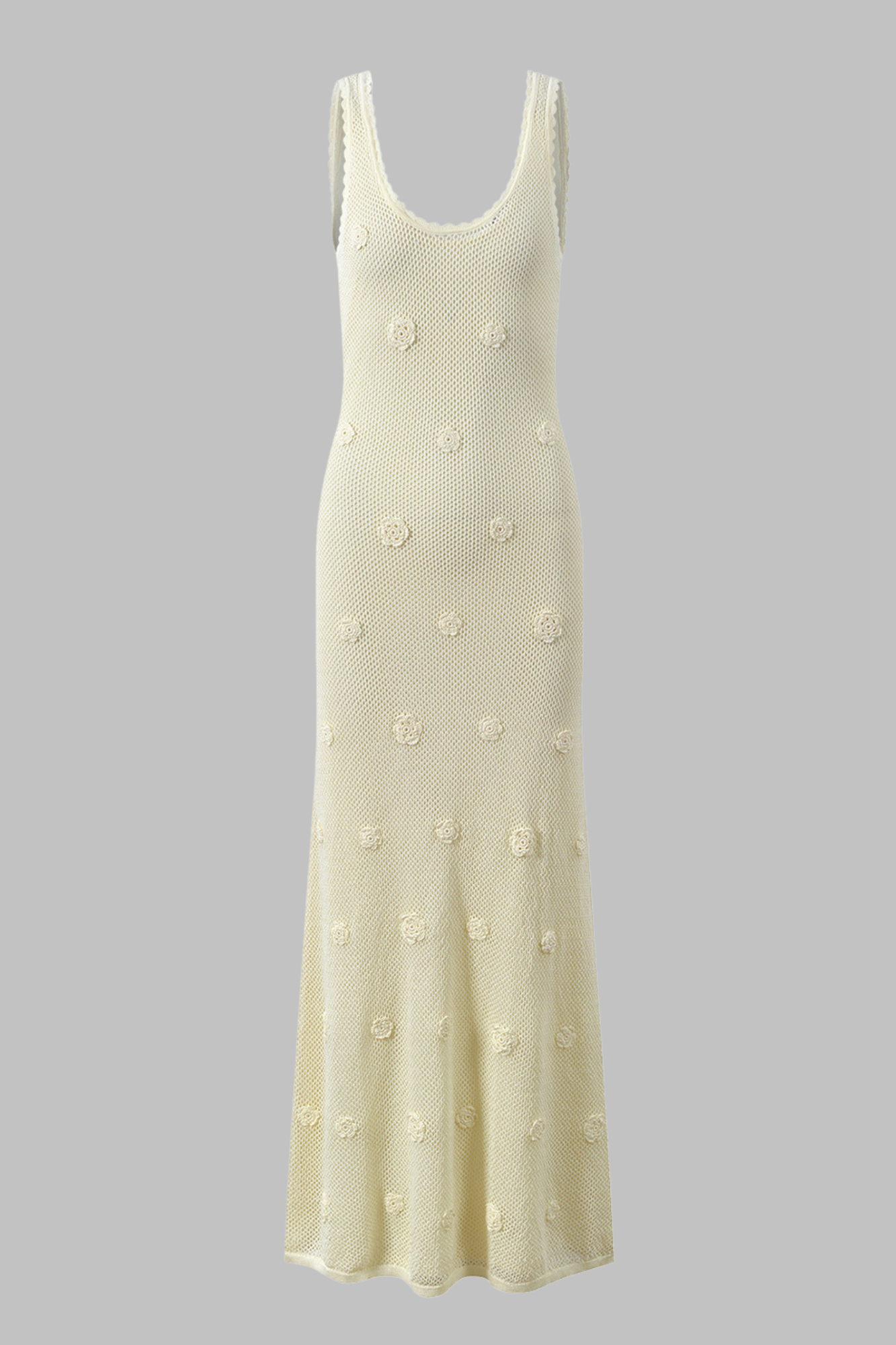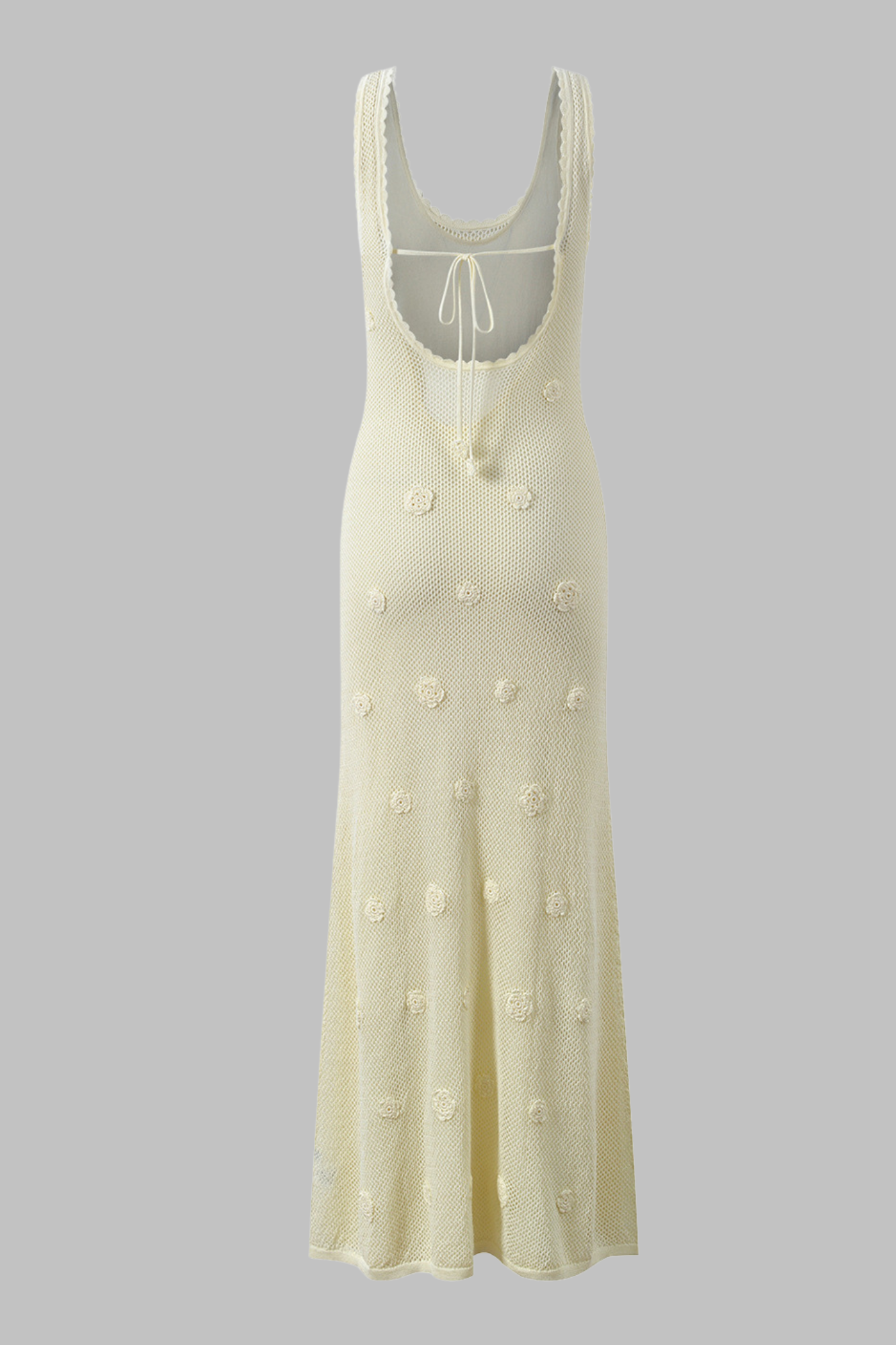 Elevate your summer wardrobe with this stunning Crochet Blossom Back-Tie Maxi Dress, a blend of elegance and bohemian charm. Crafted from airy crochet knit, this sleeveless maxi dress features delicate 3D floral crochet patterns scattered throughout for a romantic touch. The scalloped edges along the neckline and straps add femininity, while the open back with adjustable tie detail ensures a flattering fit.