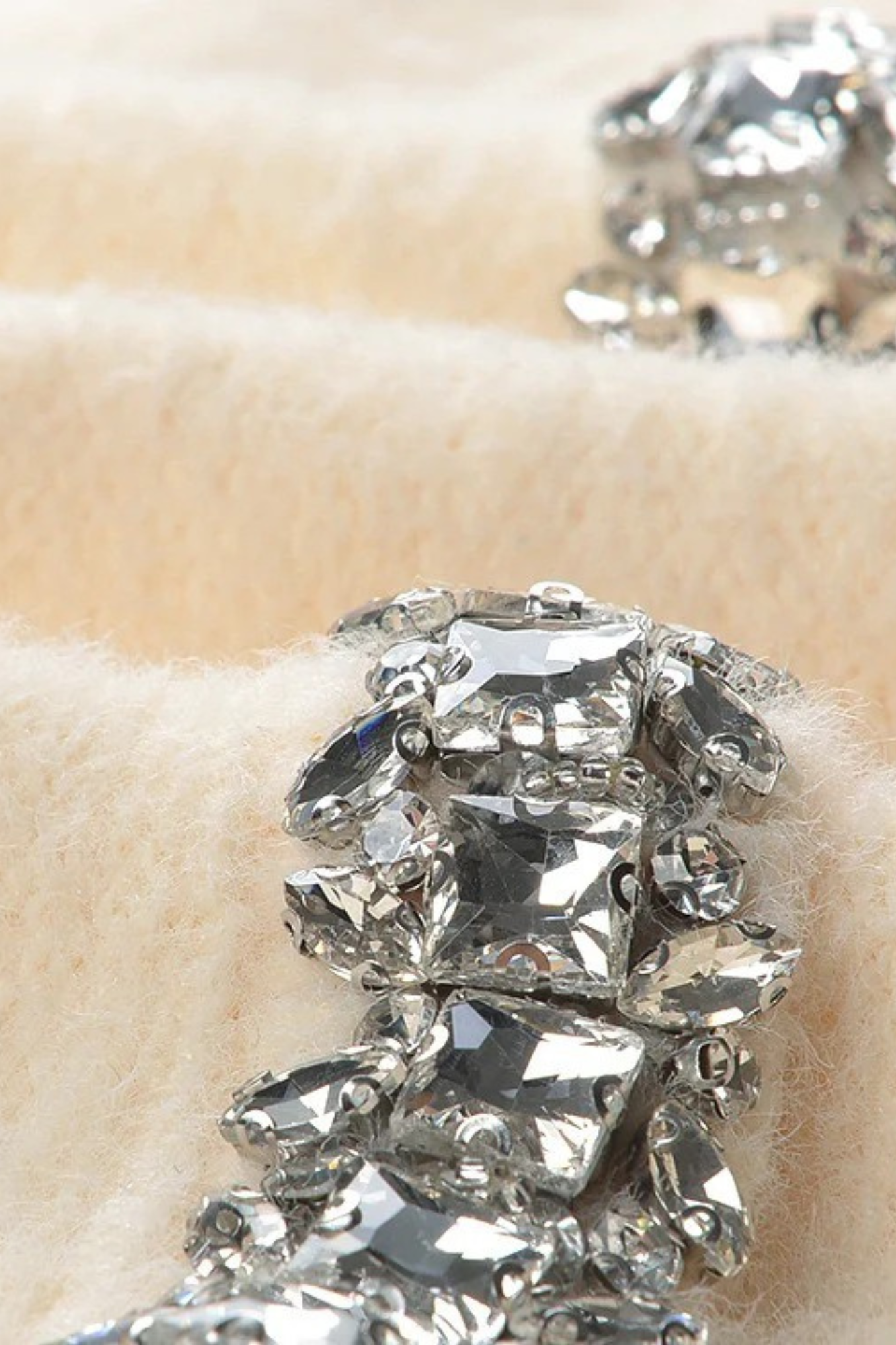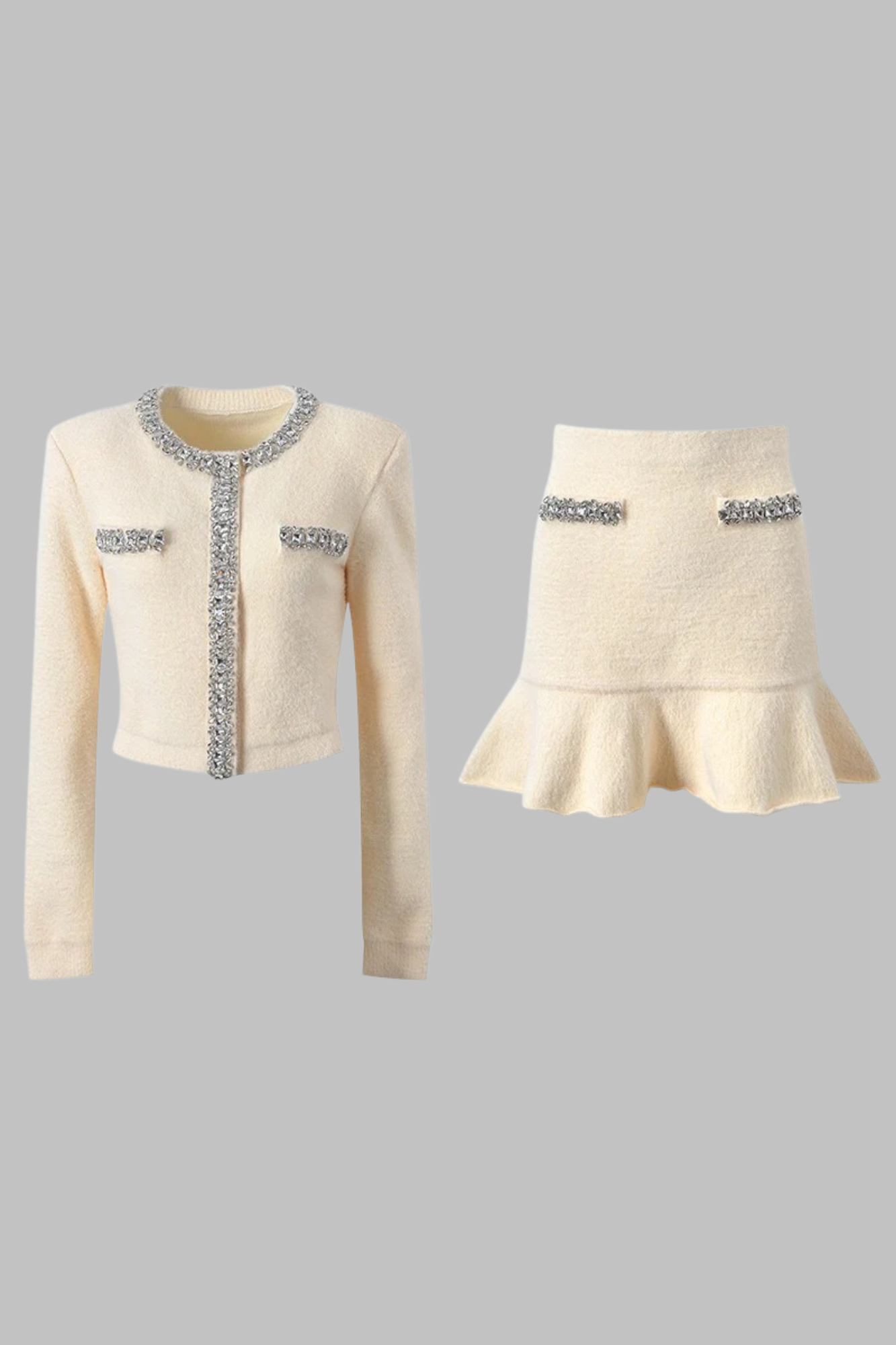 A timeless statement of elegance, this two-piece soft wool set features a long-sleeve cropped jacket adorned with crystal embellishments along the neckline, front, and faux pockets, paired with a high-waist mini skirt finished with a subtle ruffled hem. Crafted from luxuriously soft wool fabric with a smooth, plush texture, it offers warmth and sophistication in every detail. The cream beige tone adds a refined touch, perfect for brunches, winter gatherings, or elegant evenings.