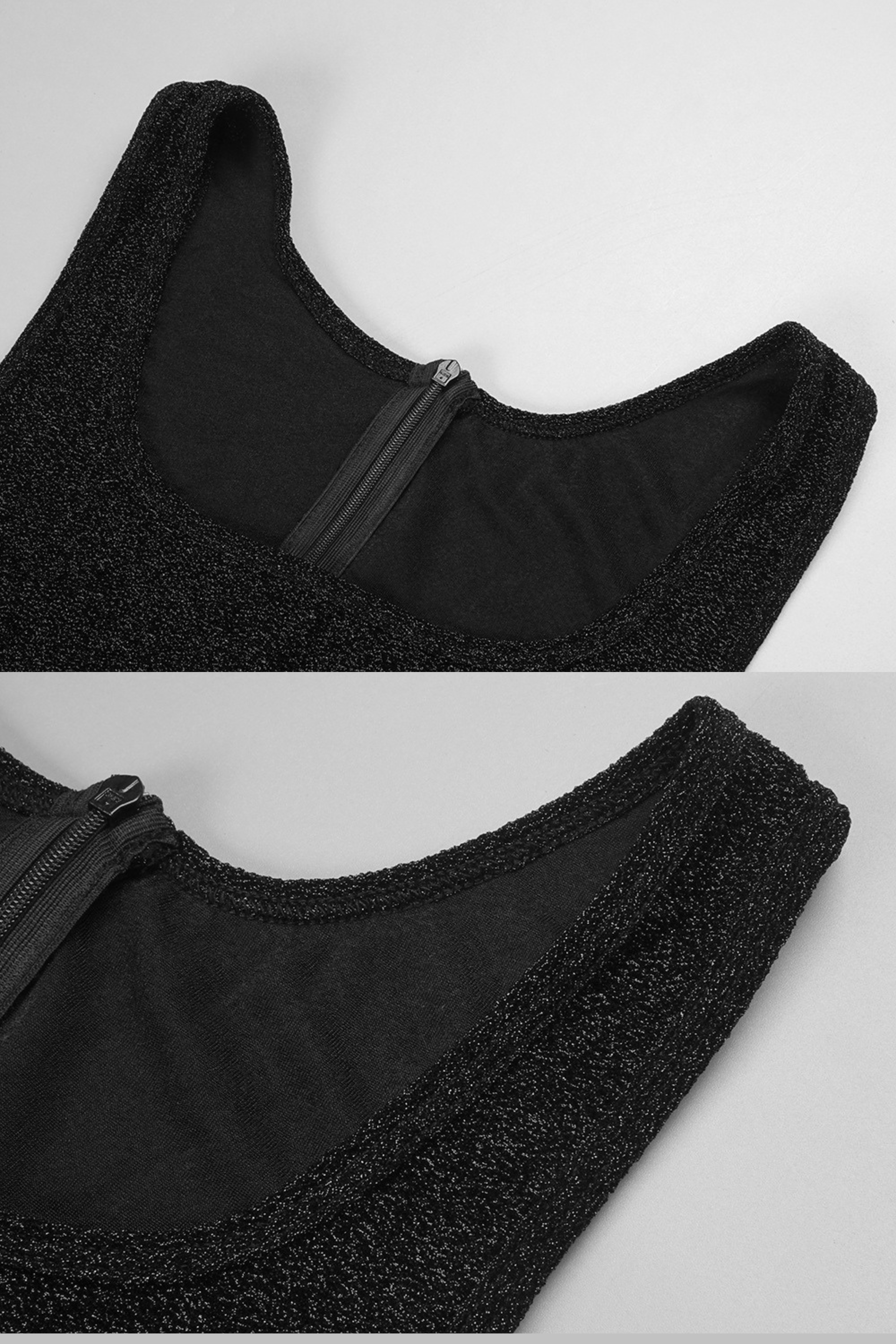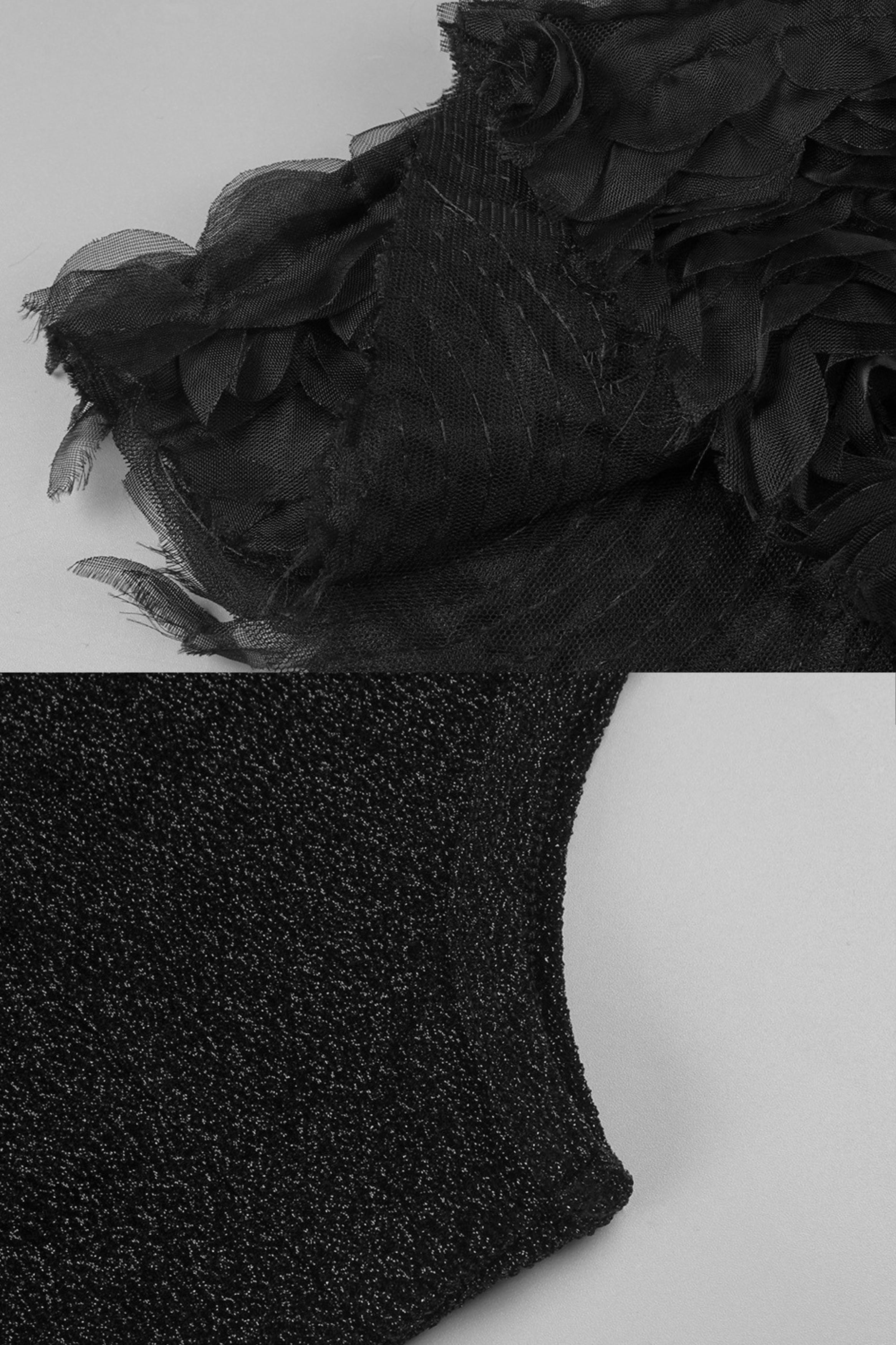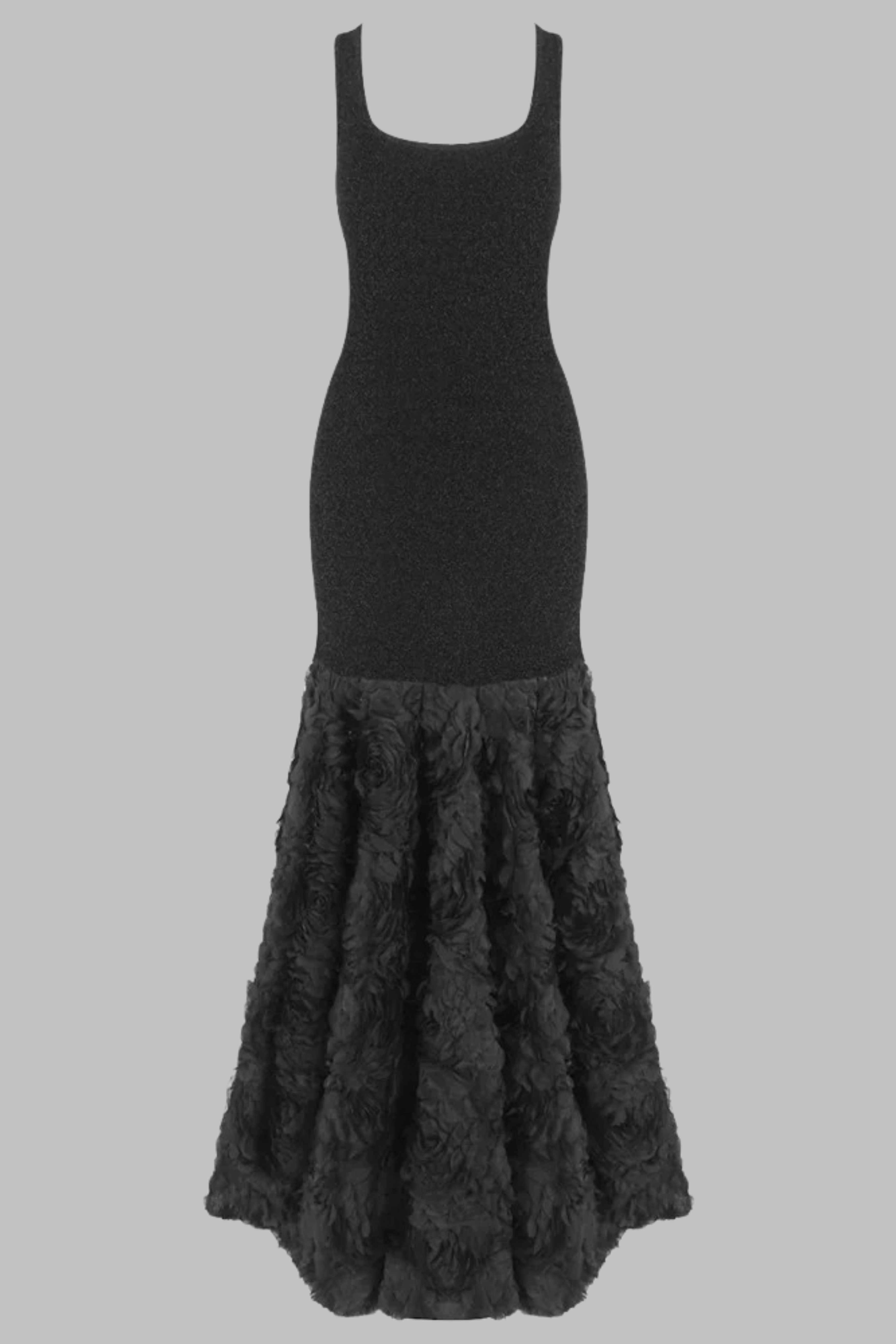 Glamorous Black Mermaid Long Dress Sleeveless Scoop Neck, Glitter Knit Bodice with 3D Rosette Feathered Skirt