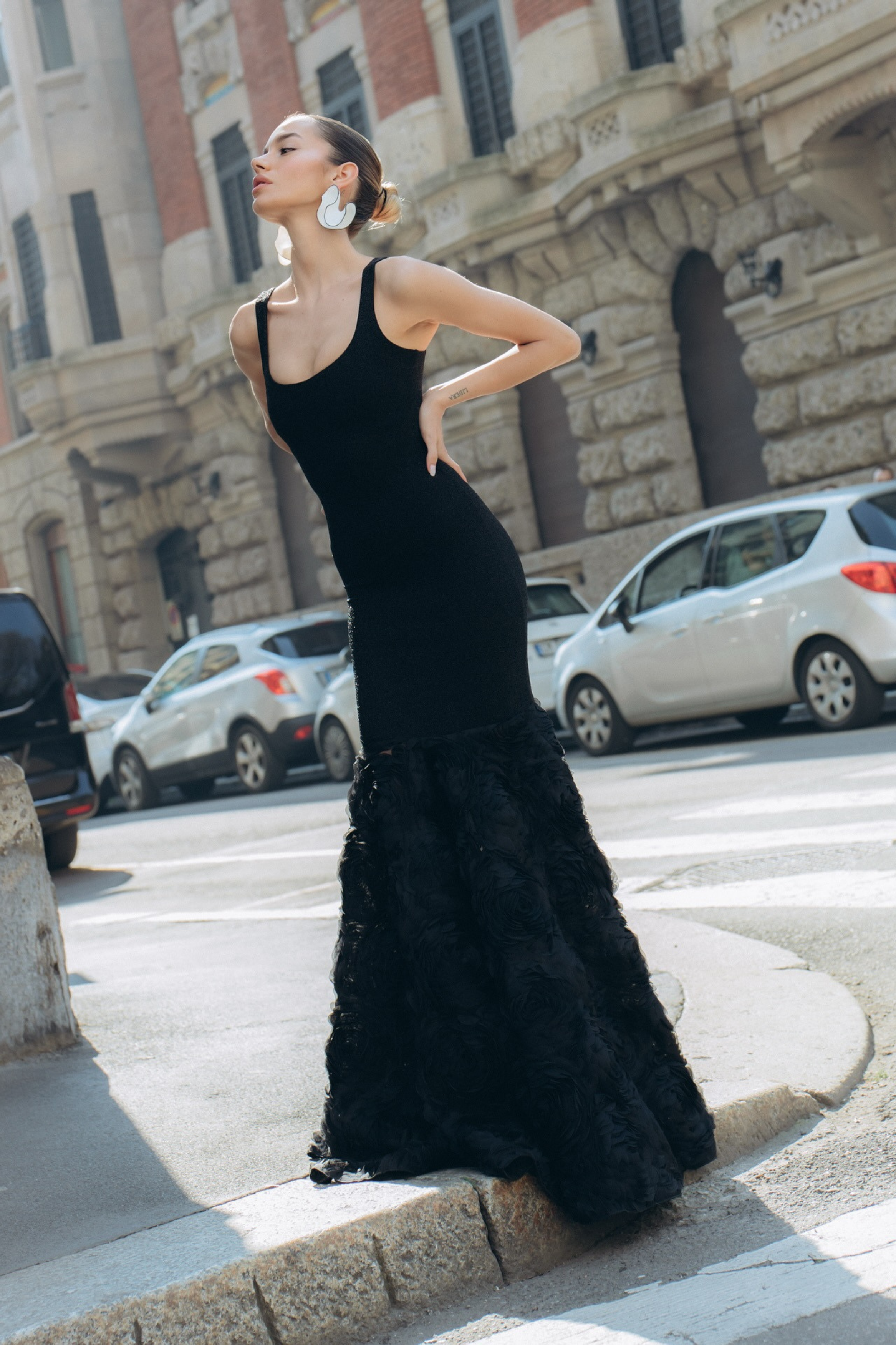 Turn heads in this striking mermaid-style gown, featuring a body-hugging glitter knit bodice with a sleeveless scoop neckline that highlights the shoulders and collarbone. The fitted silhouette flows dramatically into a voluminous flared hem, adorned with luxurious 3D rosette feather-inspired appliqué for a high-fashion statement. Perfect for red carpet events, galas, or formal soirées, this gown combines timeless elegance with modern couture detailing.