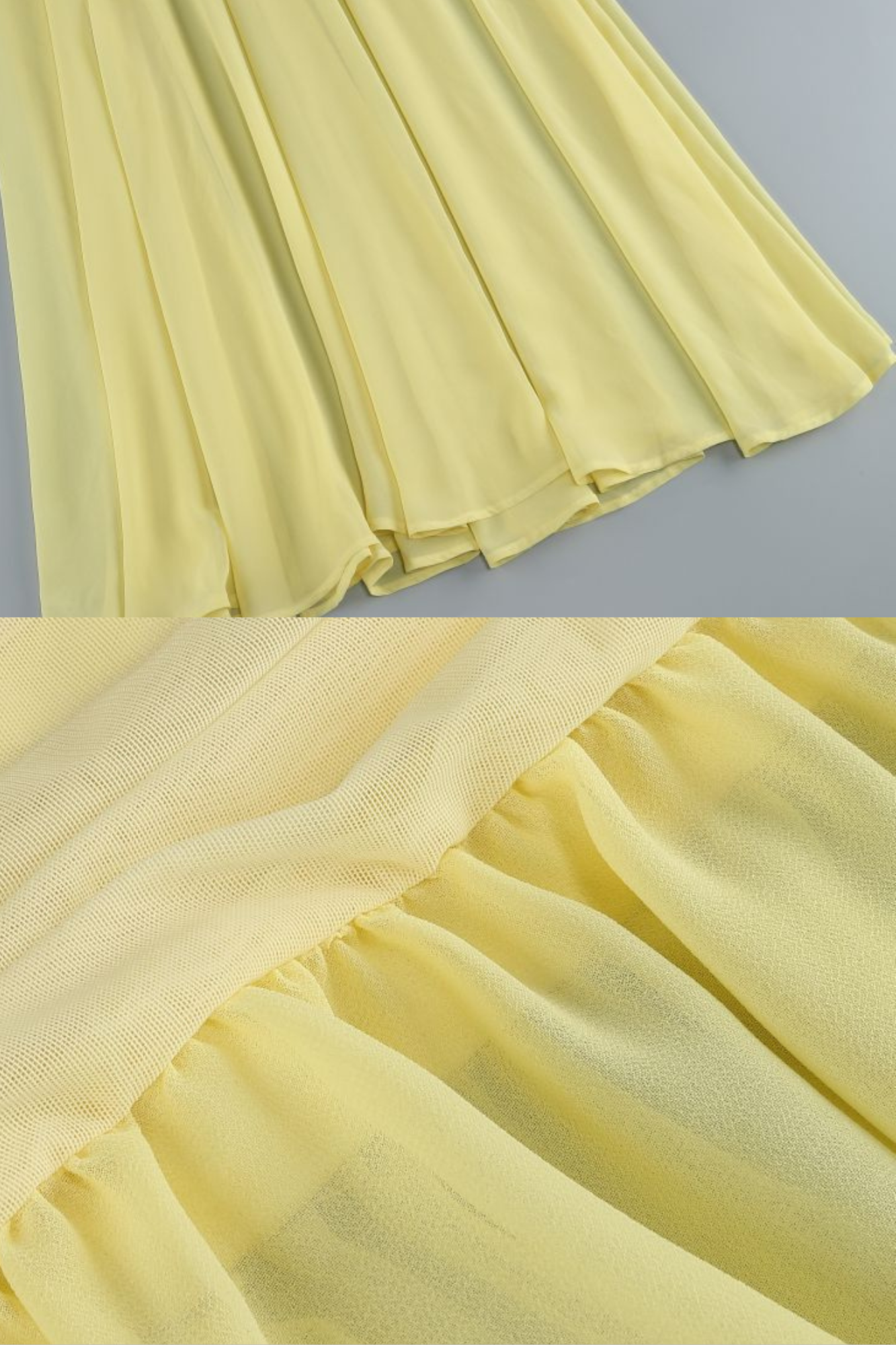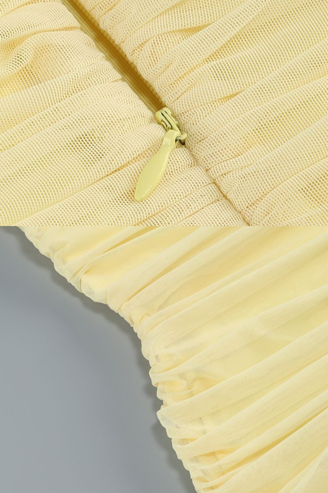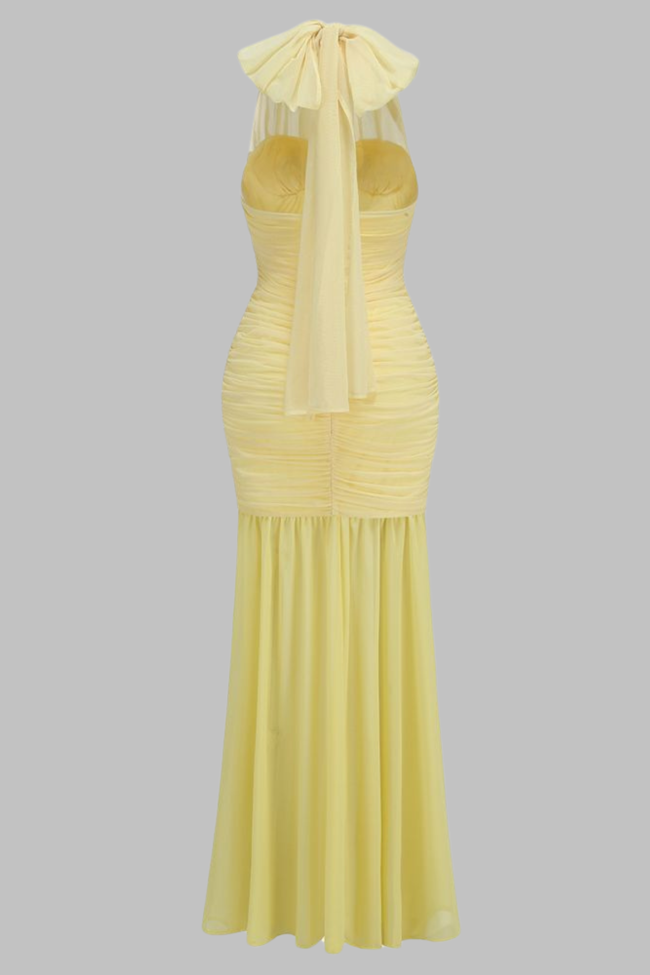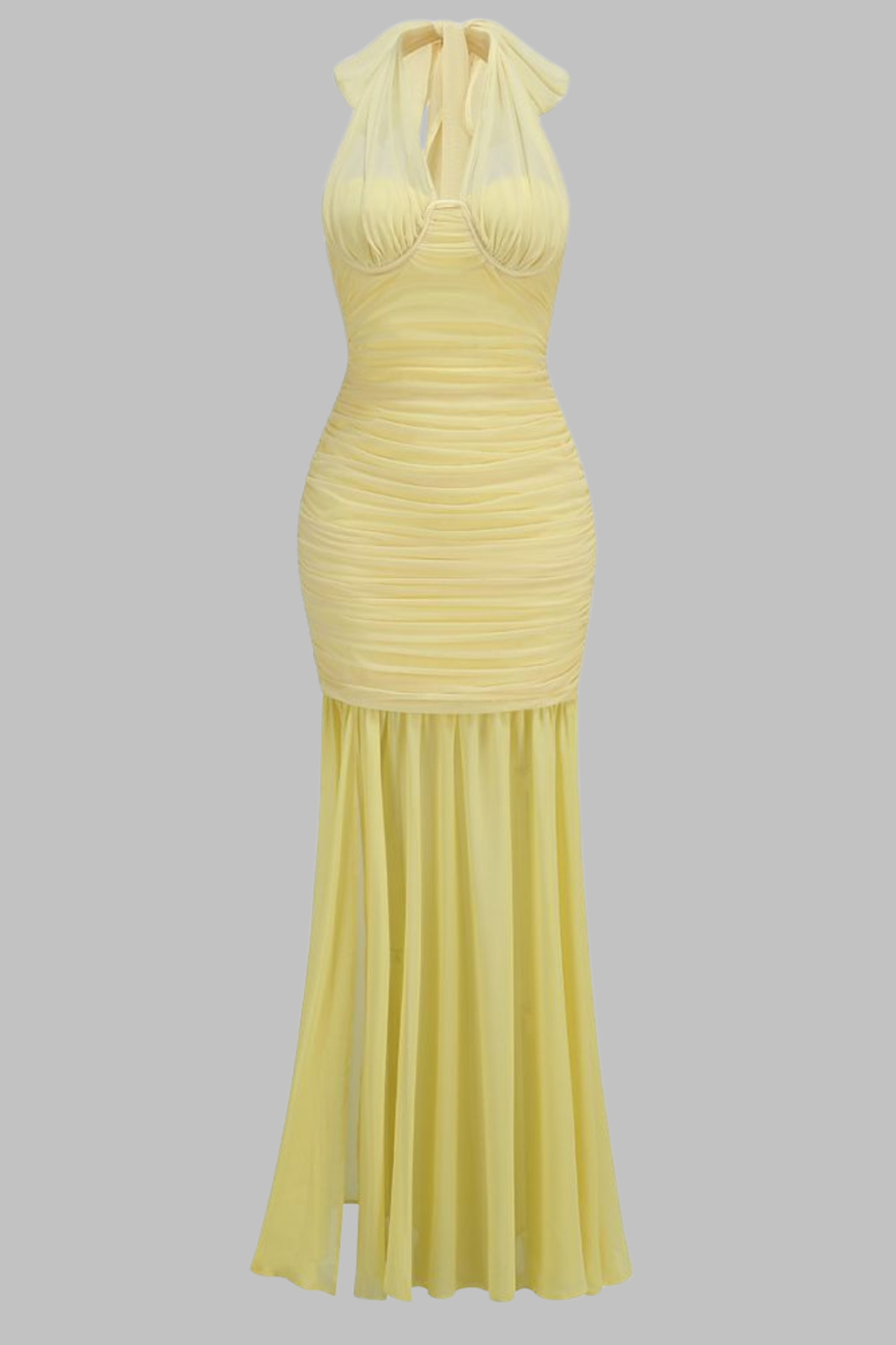 Bold and breezy yellow halter dress with mesh ruched detailing and a dramatic side slit. The flowing hem and scarf-like straps create a stunning silhouette. Ideal for beach weddings, sunset parties, or vacation nights.