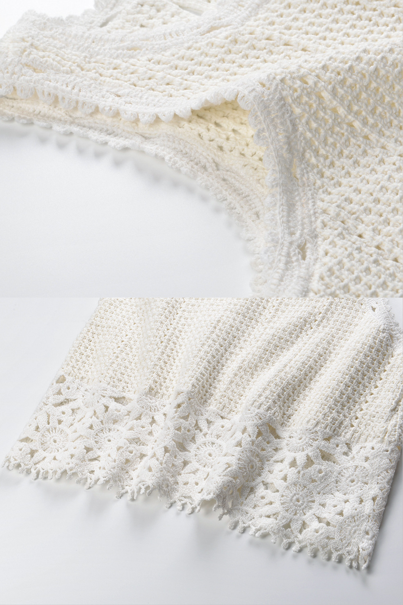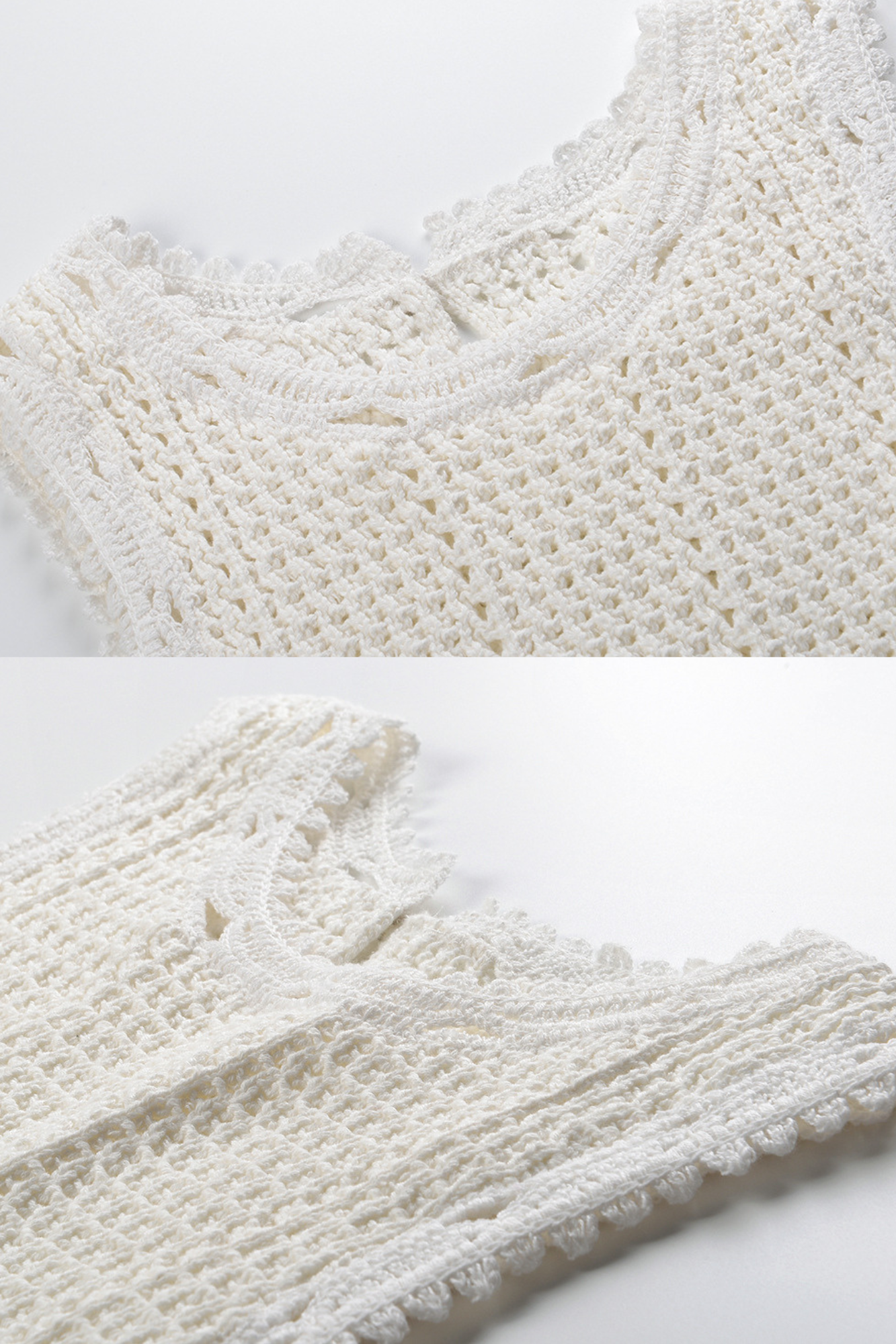 Elevate your summer style with this ivory crochet two-piece set, featuring a sleeveless vest top and matching high-waist shorts. Crafted from breathable open-knit fabric, both pieces are adorned with intricate floral lace trim along the hem for a feminine touch. The top is designed with a delicate lace collar, scalloped edges, and a keyhole button closure at the back, while the shorts offer a comfortable fit with a structured waistband. Perfect for beach getaways, resort lounging, or chic daytime outings, this set combines effortless elegance with relaxed comfort.