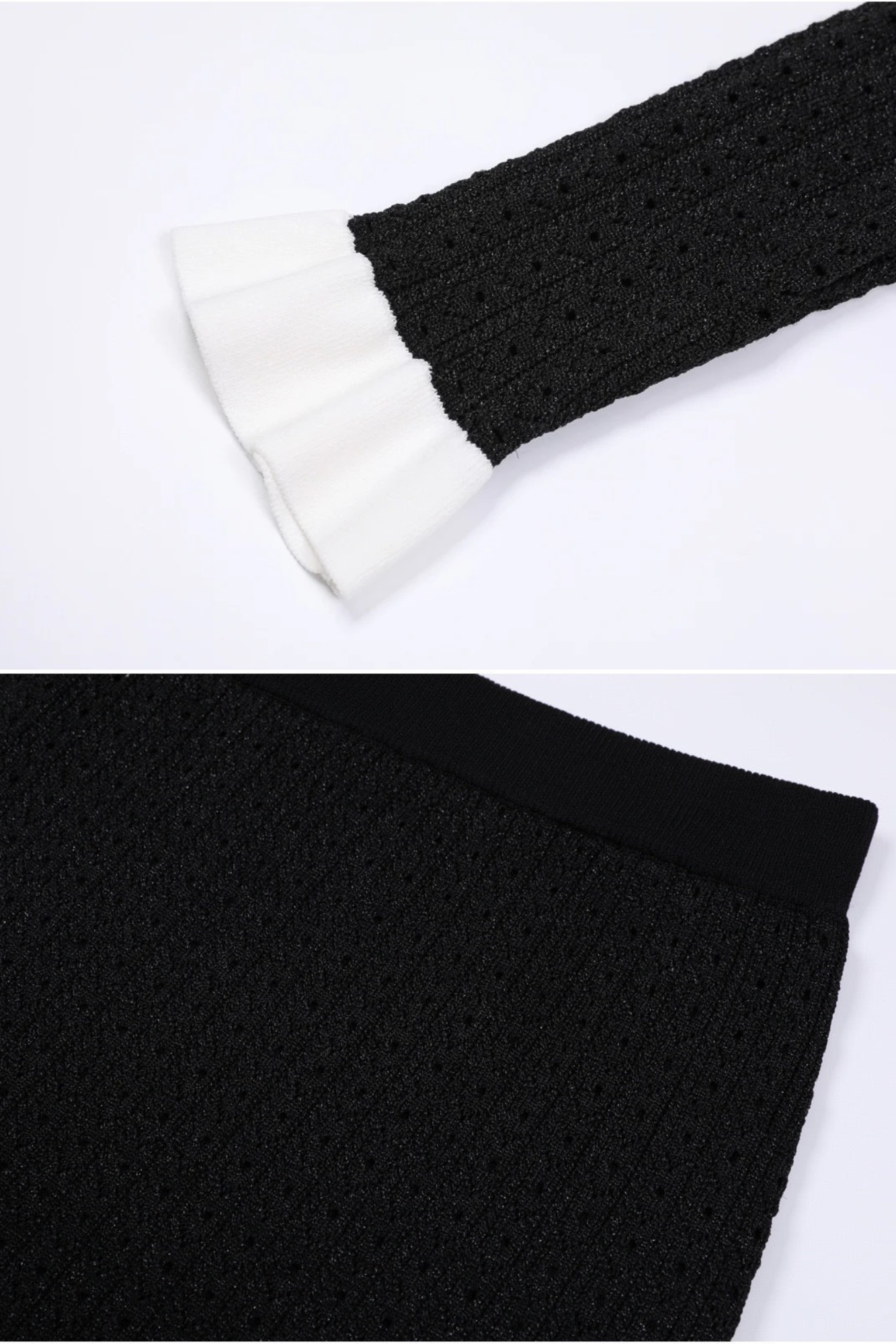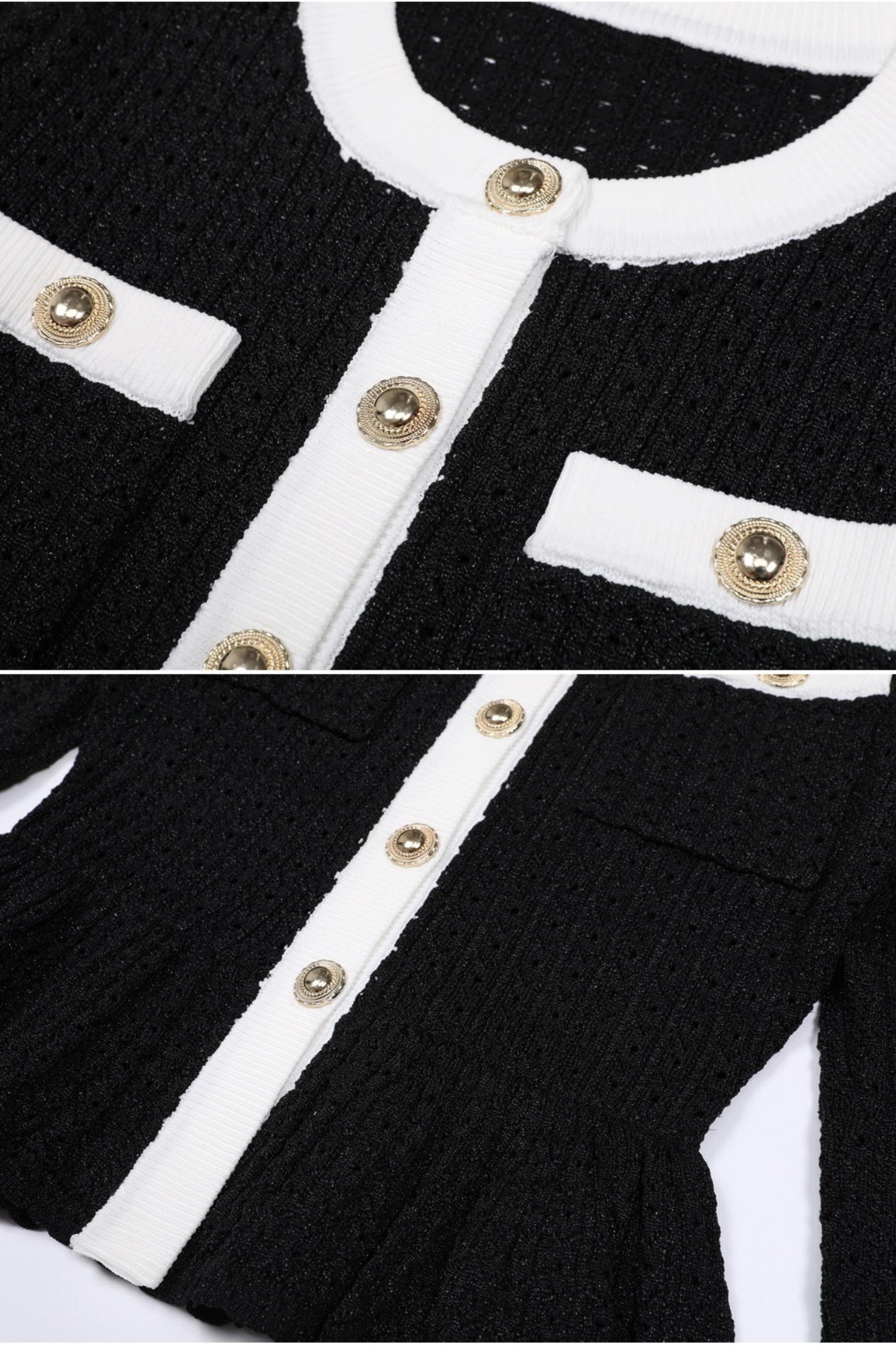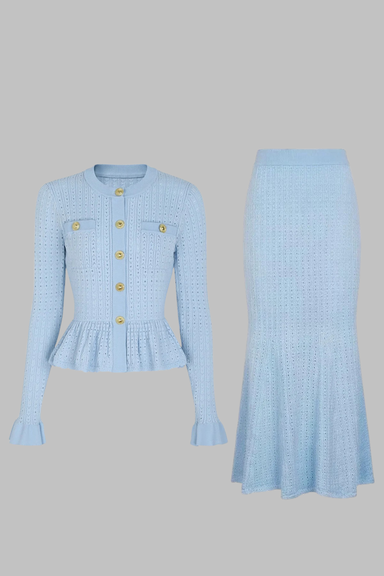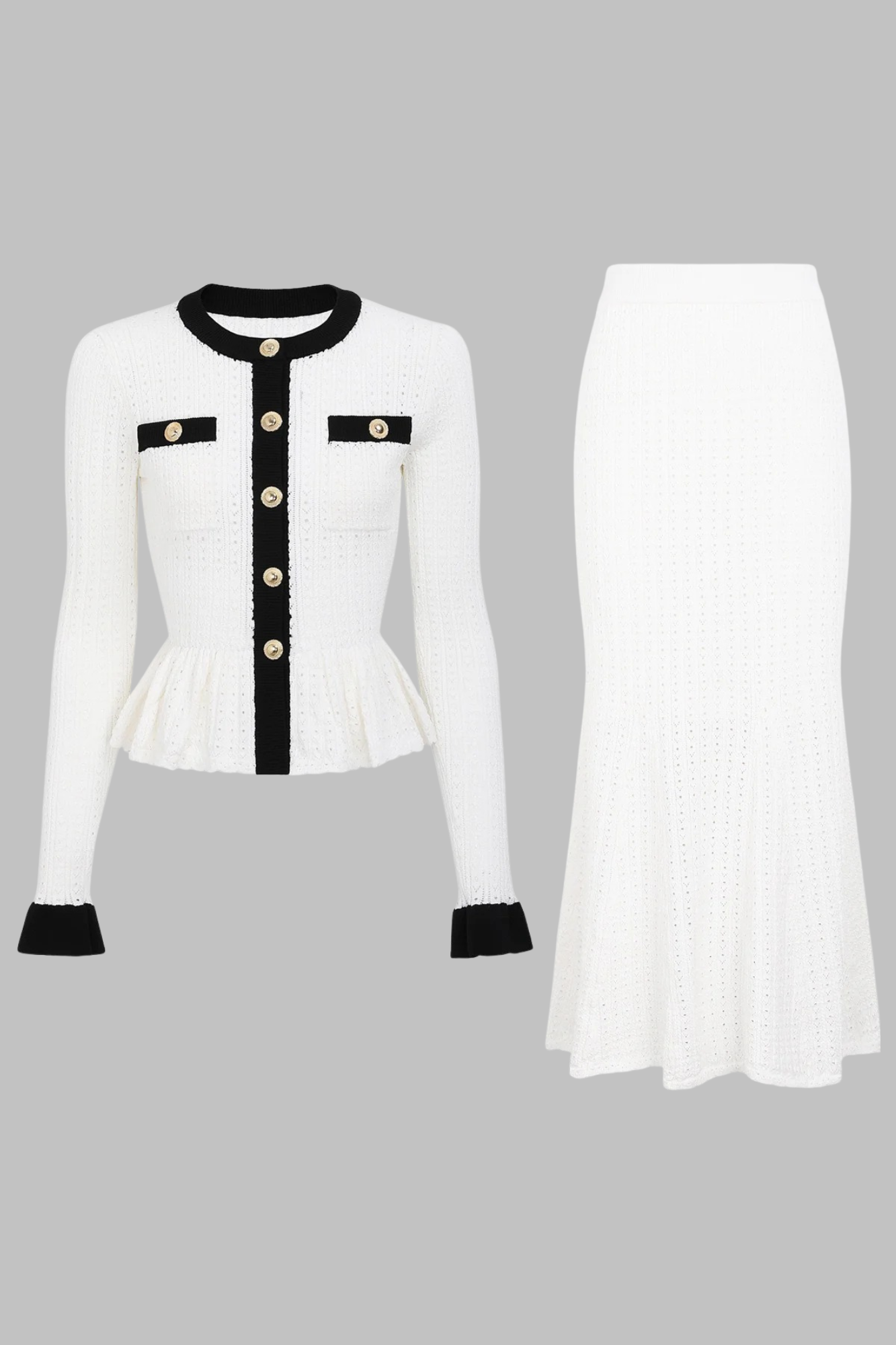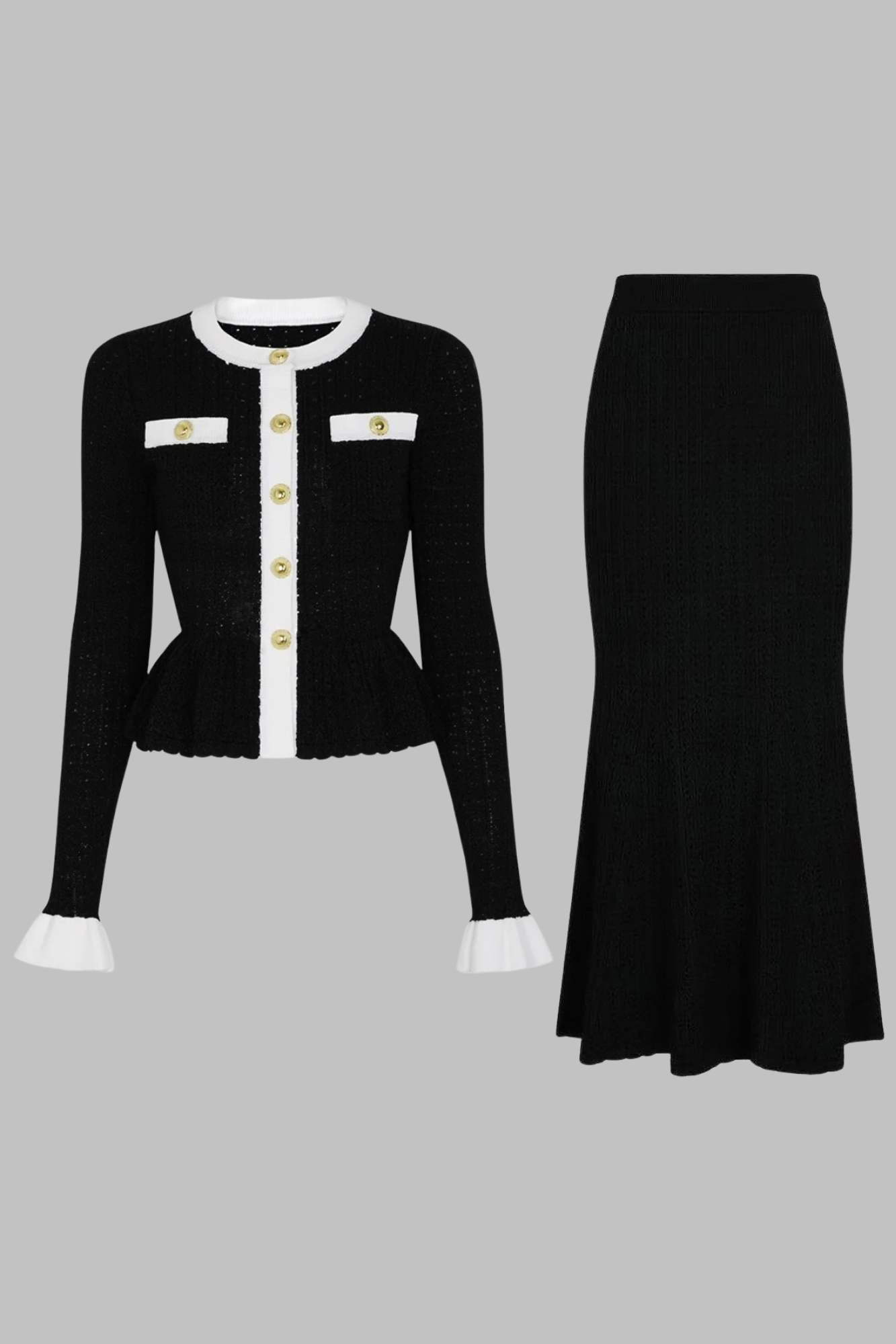 Sophisticated and elegant, this knitted two-piece set features a round neckline cardigan with a peplum waist and gold-tone buttons, paired with a matching midi-long mermaid skirt. The cardigan is beautifully detailed with contrasting trim along the neck, placket, and cuffs, adding a touch of classic charm. Crafted from a soft textured knit, the set flatters the figure while offering comfort and stretch — perfect for chic daytime outings or evening sophistication.