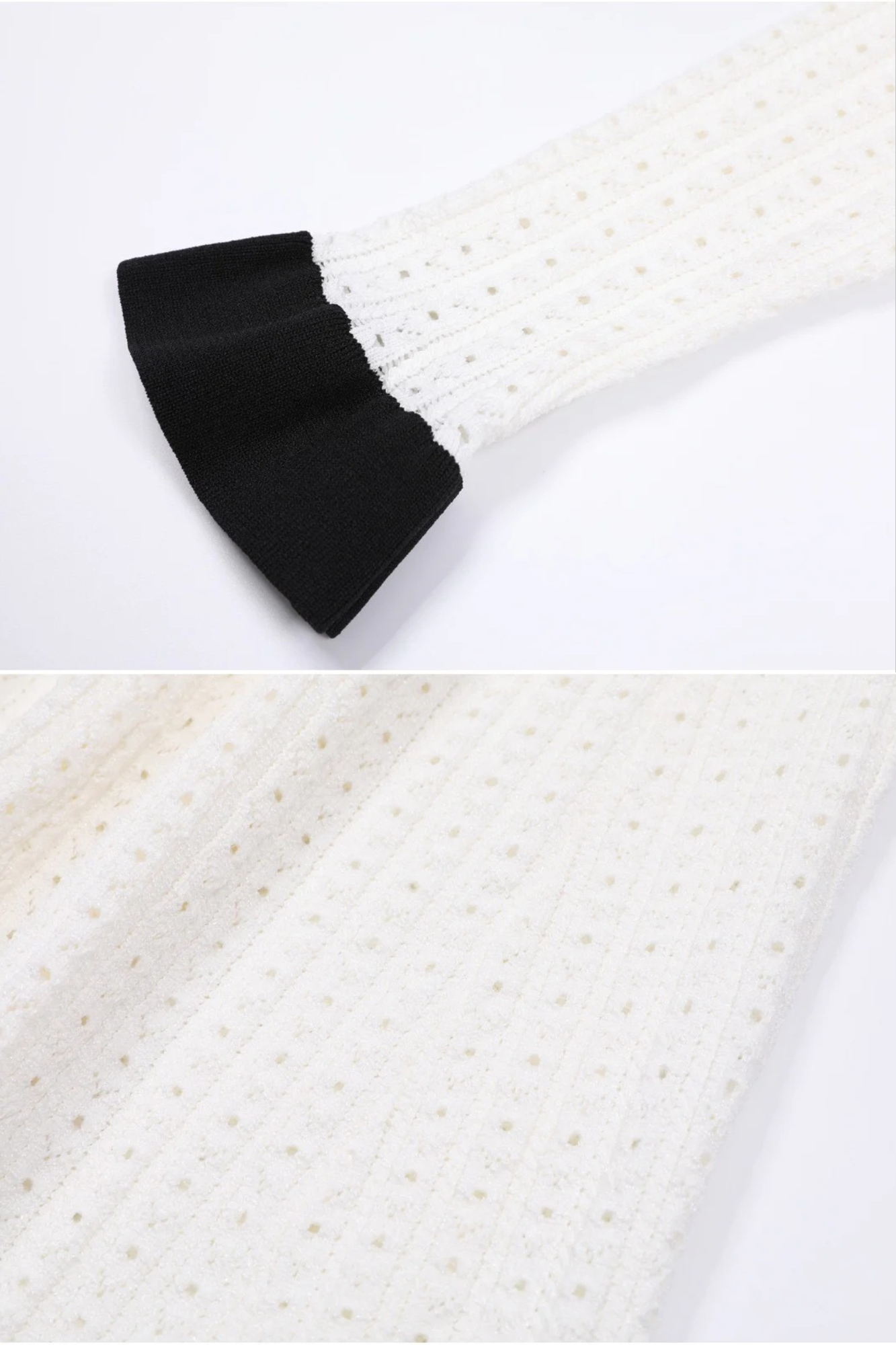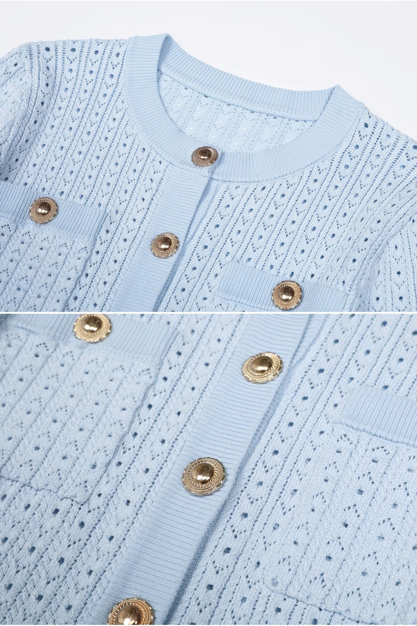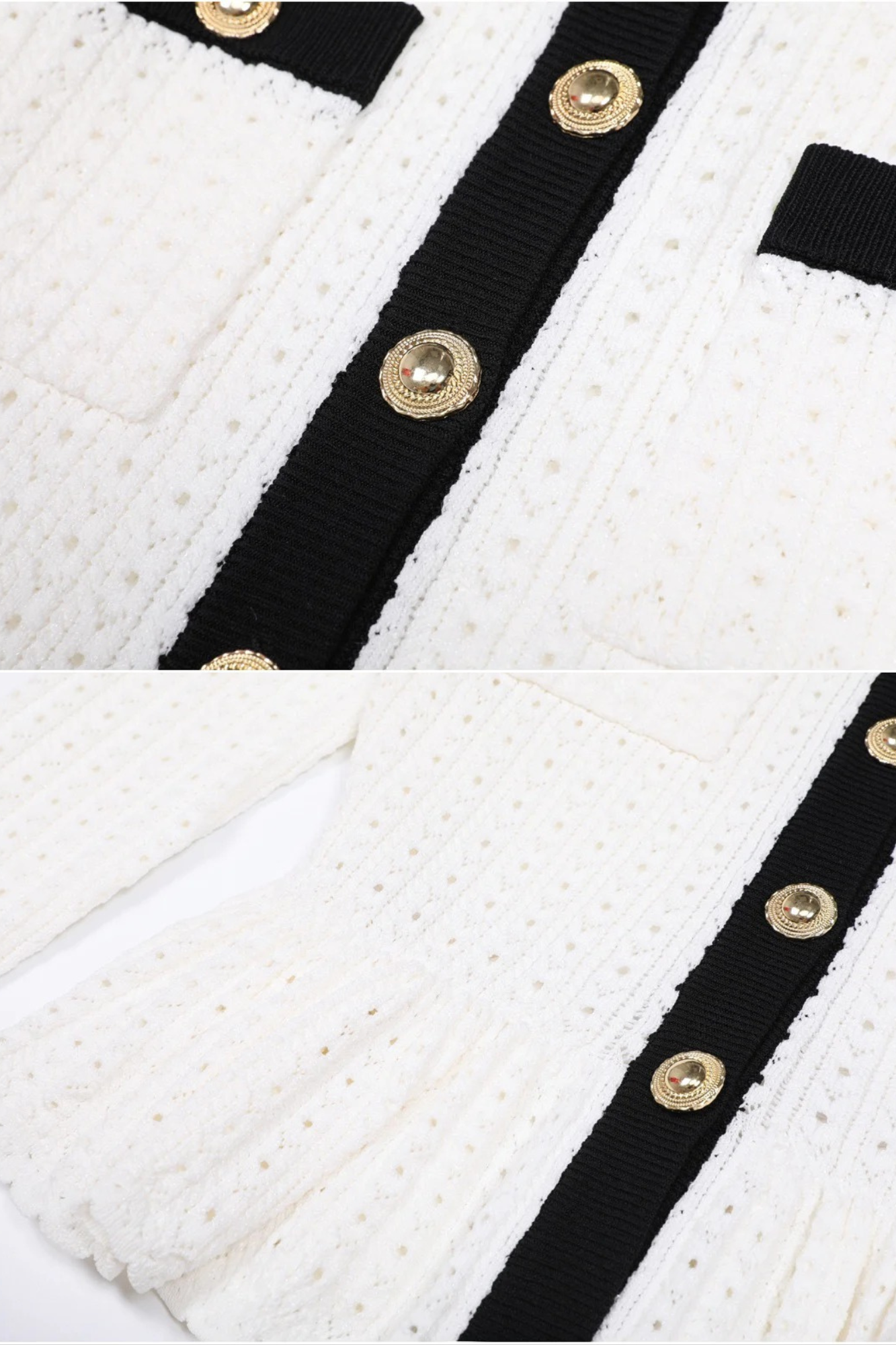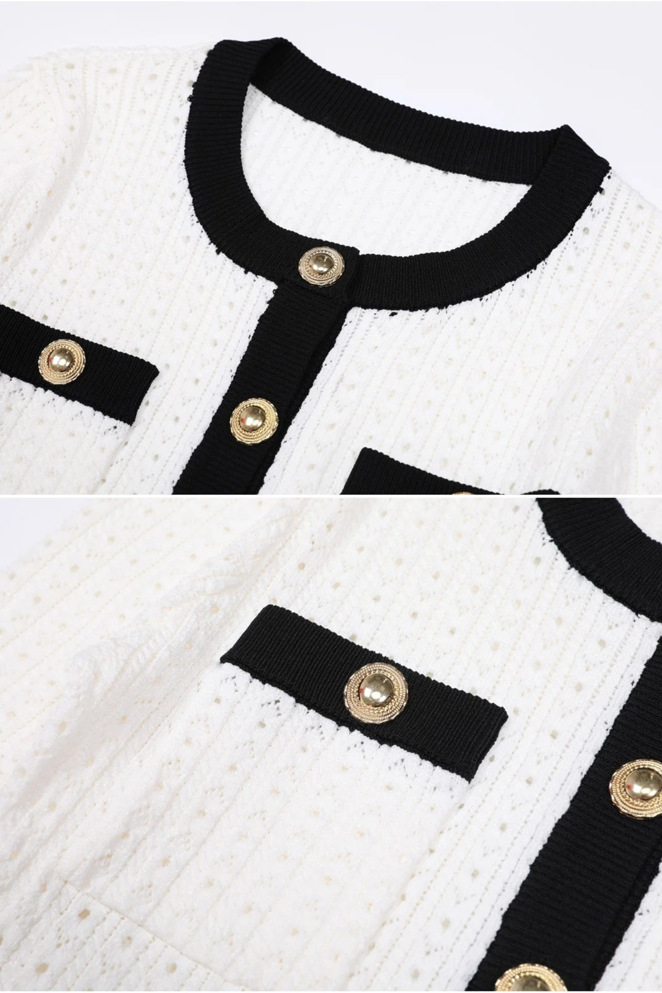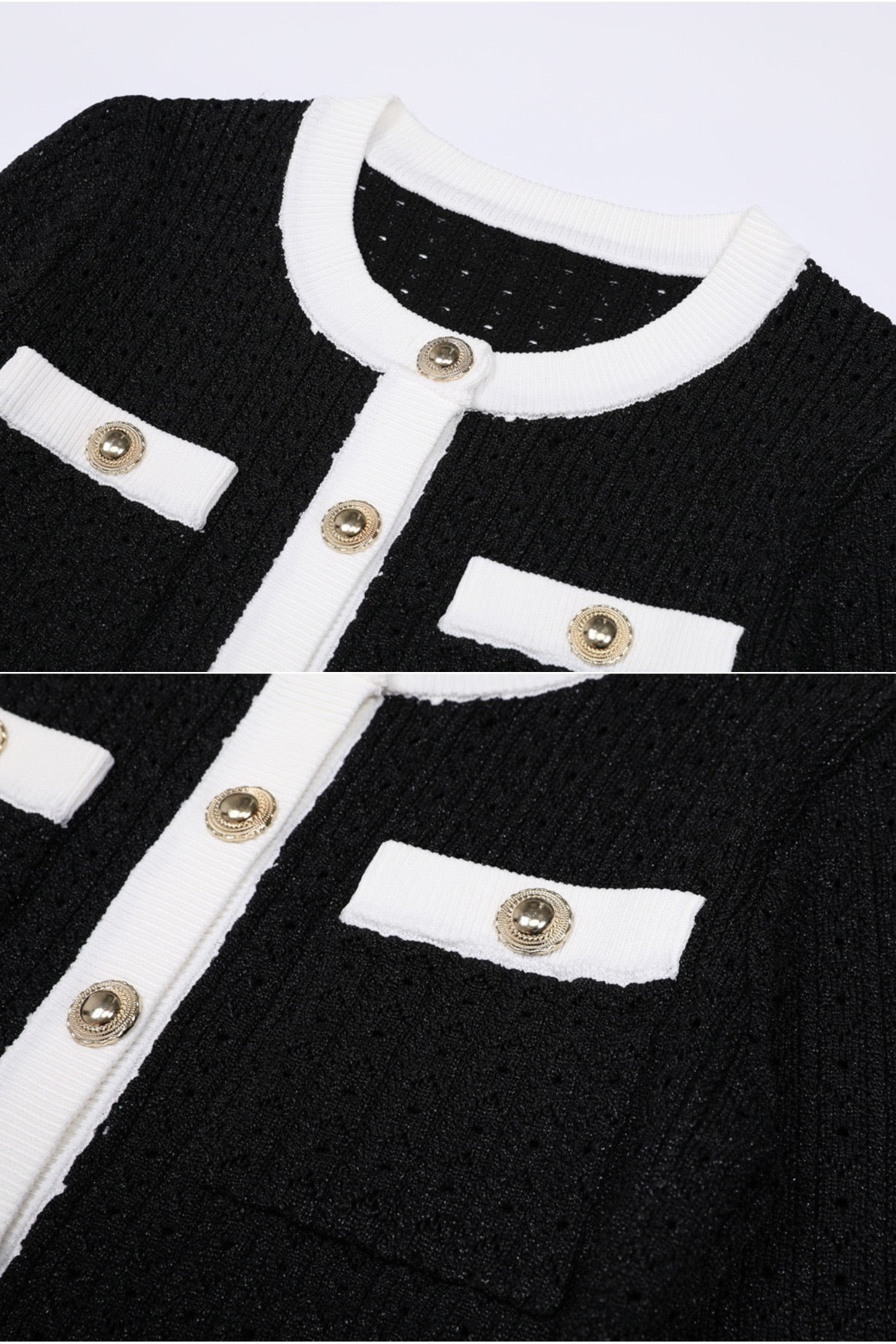 Sophisticated and elegant, this knitted two-piece set features a round neckline cardigan with a peplum waist and gold-tone buttons, paired with a matching midi-long mermaid skirt. The cardigan is beautifully detailed with contrasting trim along the neck, placket, and cuffs, adding a touch of classic charm. Crafted from a soft textured knit, the set flatters the figure while offering comfort and stretch — perfect for chic daytime outings or evening sophistication.