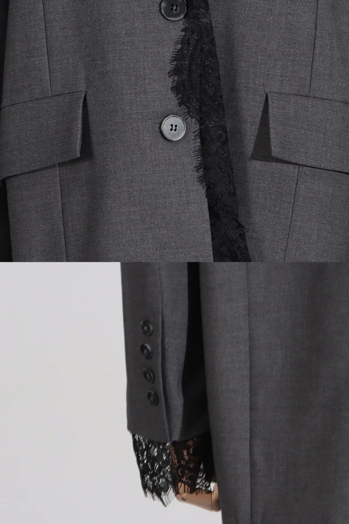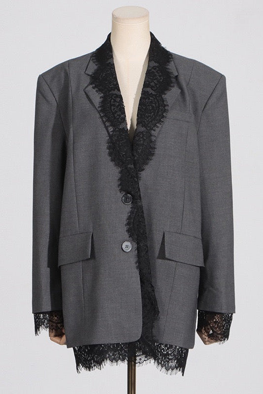 Exude refined elegance with this lace-trimmed oversized blazer, designed with a perfect balance of structure and femininity. The classic tailored silhouette features a deep V-lapel edged in intricate black lace that continues along the cuffs and hem for a romantic contrast. Crafted from premium woven fabric with a smooth drape, it’s ideal to wear as a statement blazer or styled as a chic mini dress for evening looks.