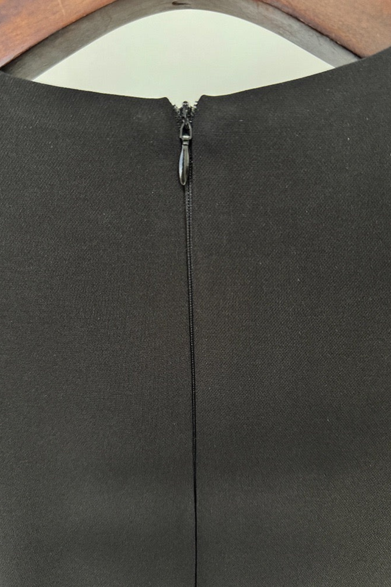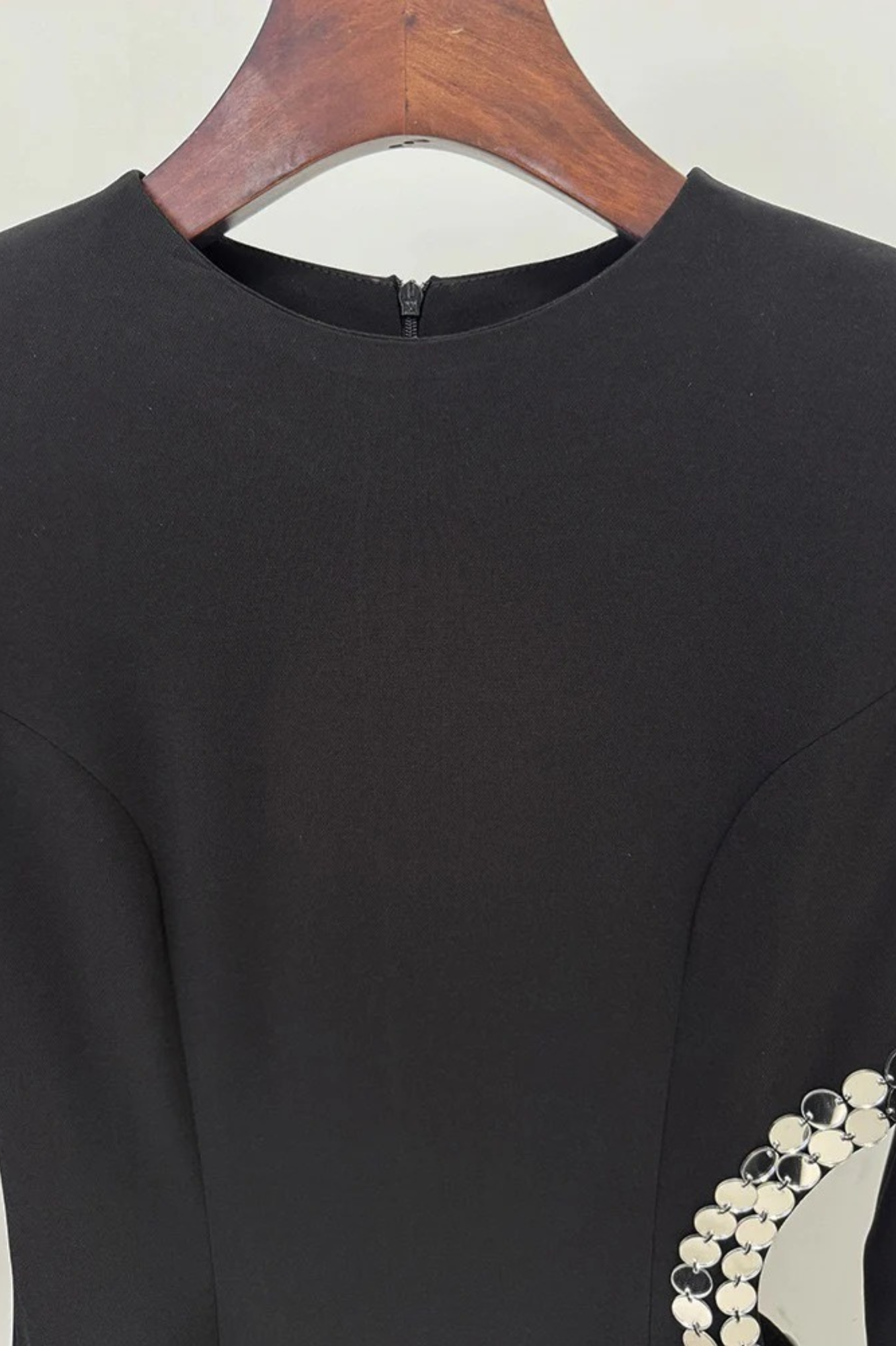 Make a bold statement in this floor-length black gown featuring sleek long sleeves, a figure-hugging silhouette, and daring side cutouts embellished with reflective sequin discs. The high side slit enhances movement and allure, while the unique curved cutout design adds a modern, glamorous edge. Perfect for galas, evening parties, and red-carpet events, this gown combines elegance with a touch of drama.