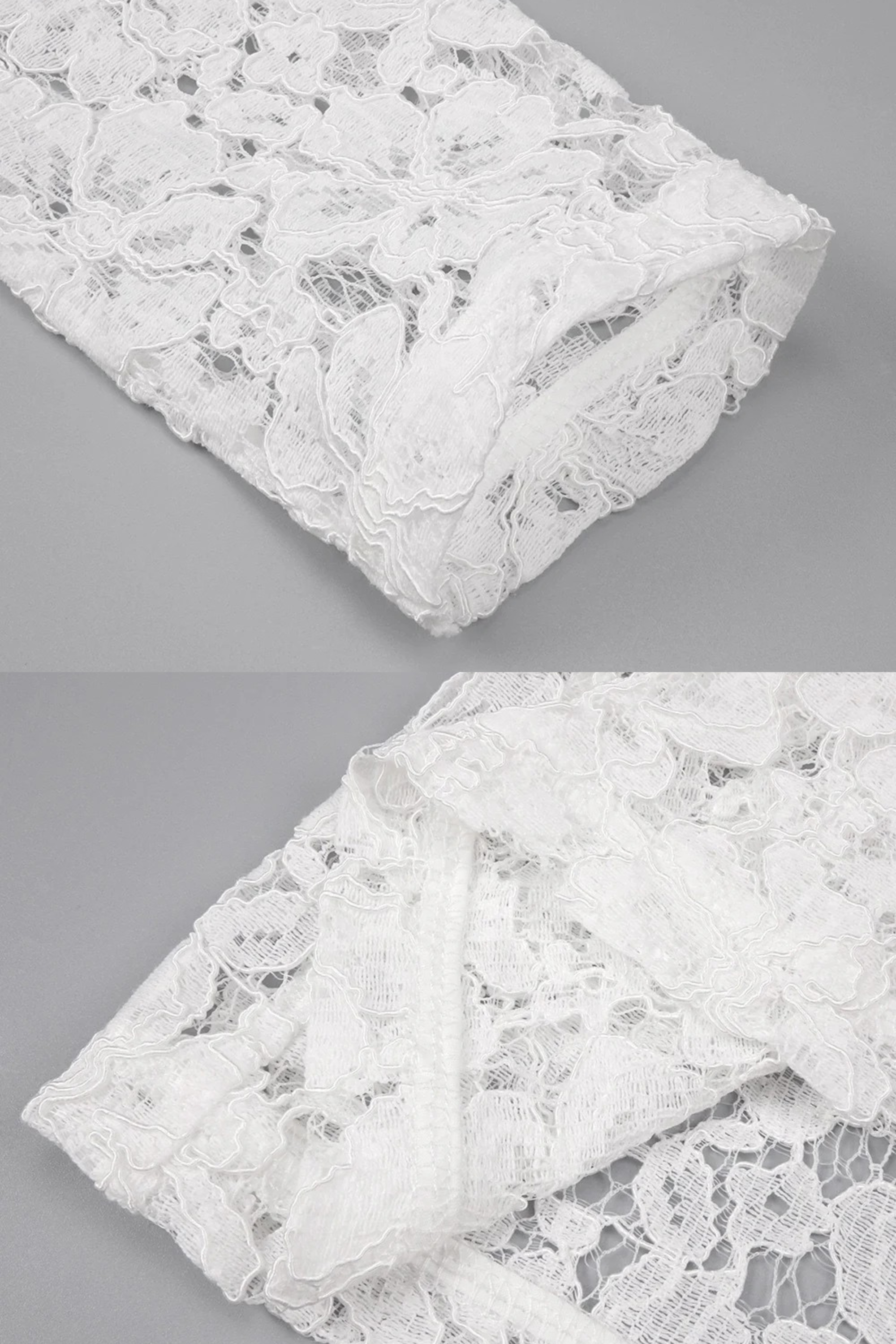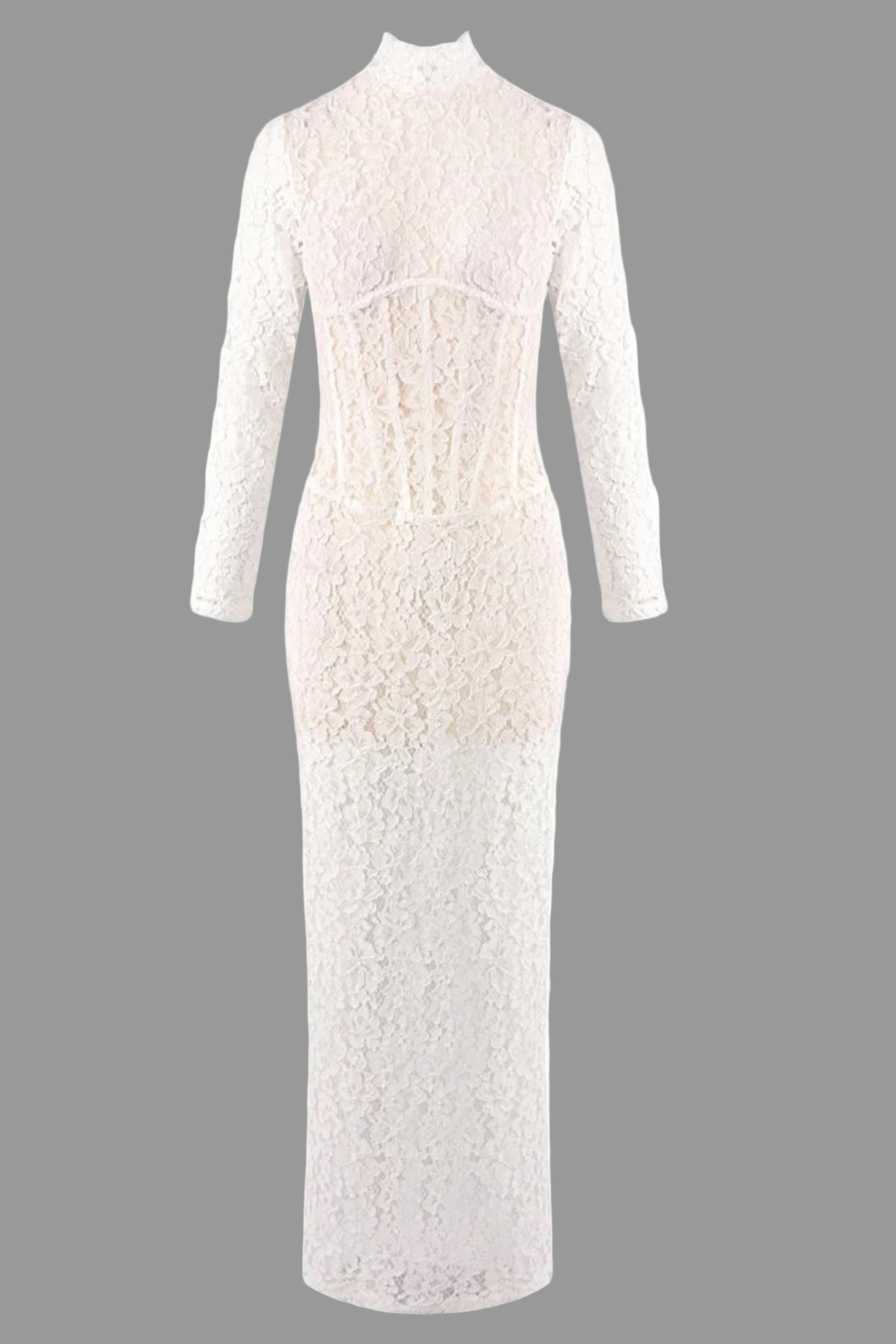 An elegant and sultry lace maxi dress featuring a fitted high neckline and long sleeves with a sheer floral lace pattern. The structured corset-style bodice enhances the waistline, while the full-length silhouette elongates the figure beautifully. Crafted from delicate stretch lace with a nude lining for subtle contrast, this dress delivers a perfect balance of sophistication and allure — ideal for evening events, formal occasions, or luxury dinners.
