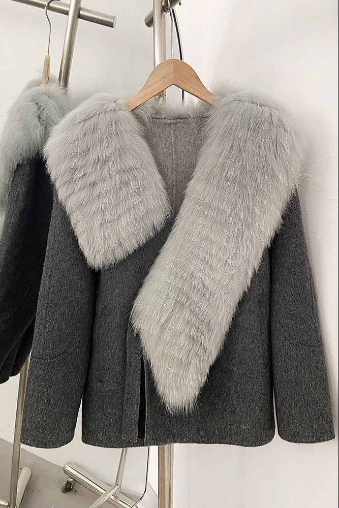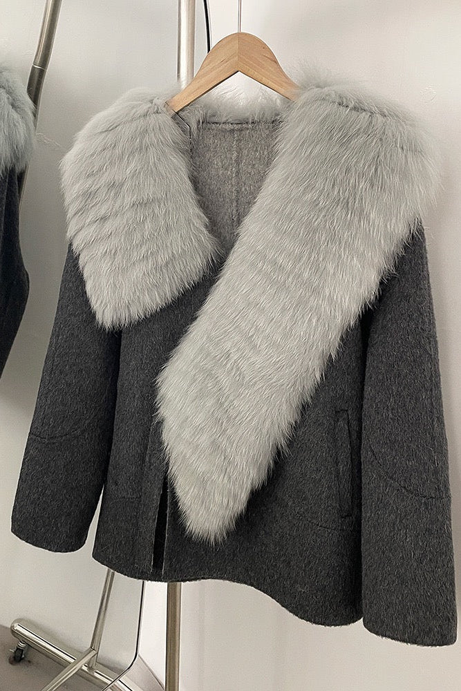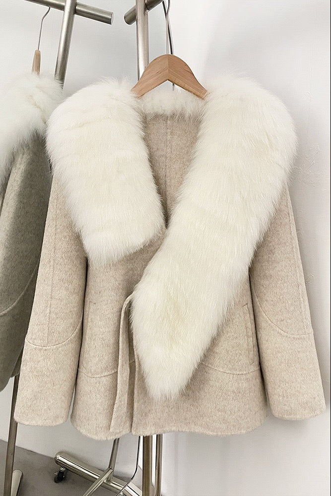 Wrap yourself in timeless elegance with this short wool-blend coat featuring a statement faux fur shawl collar. The soft, structured silhouette offers both warmth and sophistication, while the plush faux fur adds a luxurious finish. Perfect for layering over dresses or trousers, this coat is an essential winter statement piece.