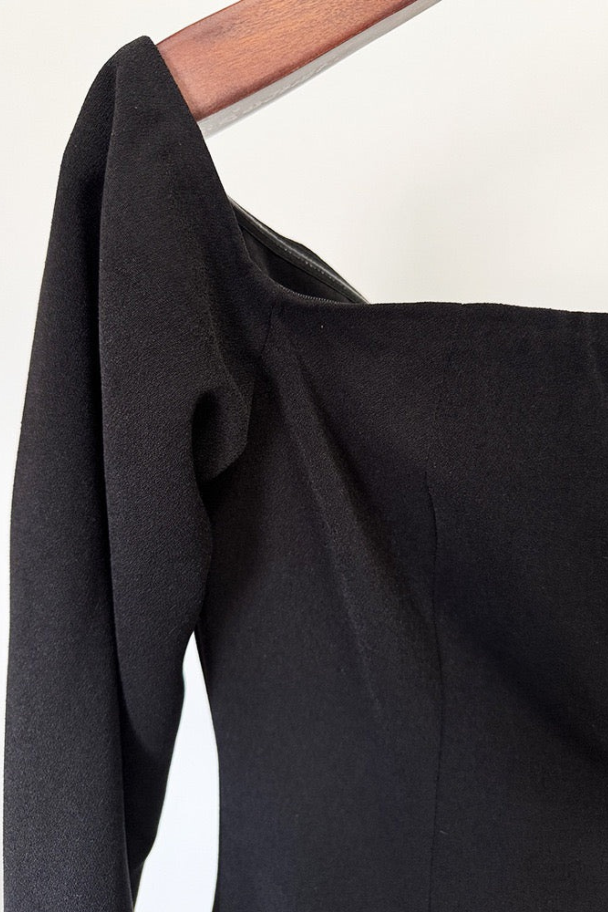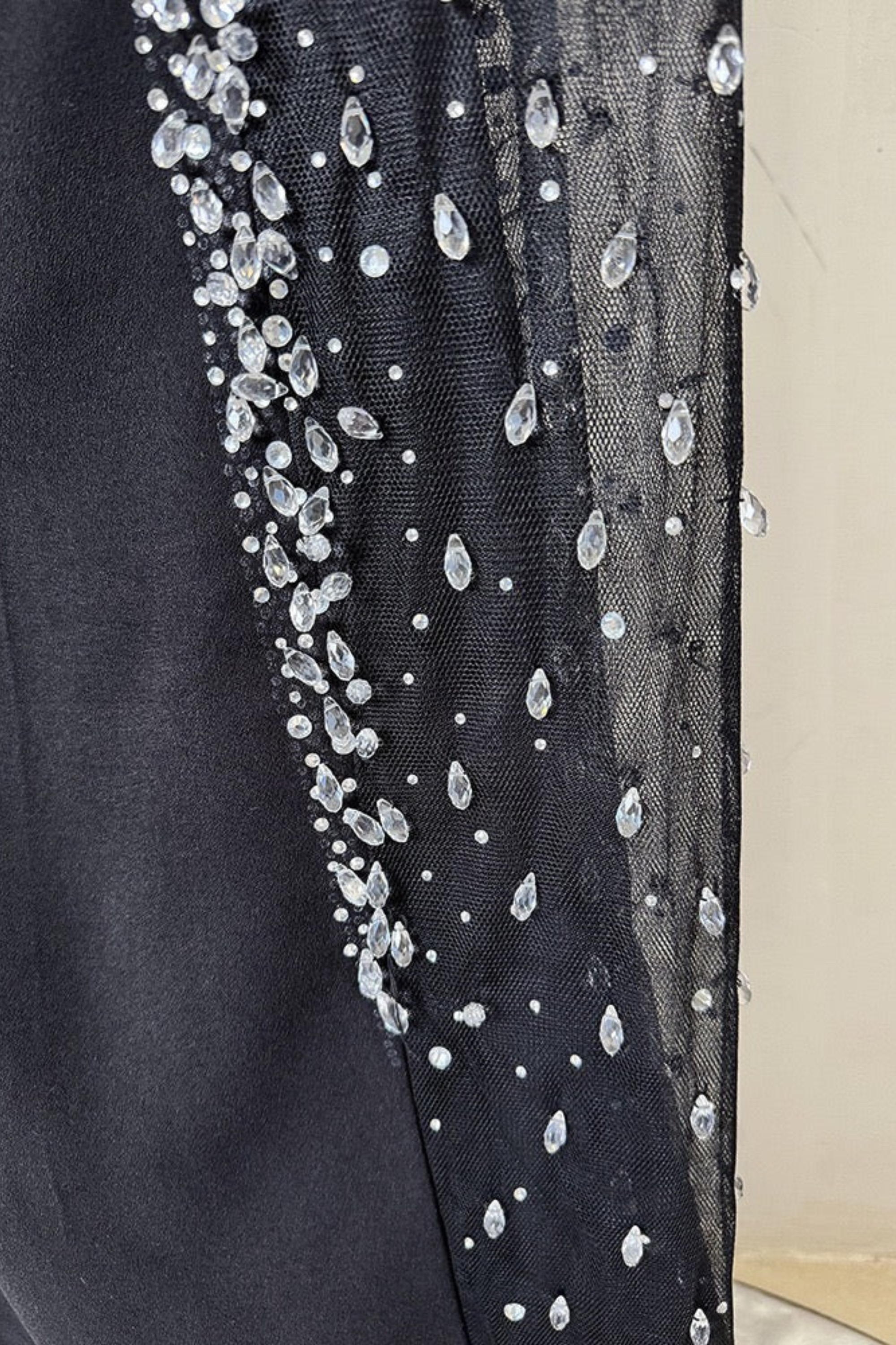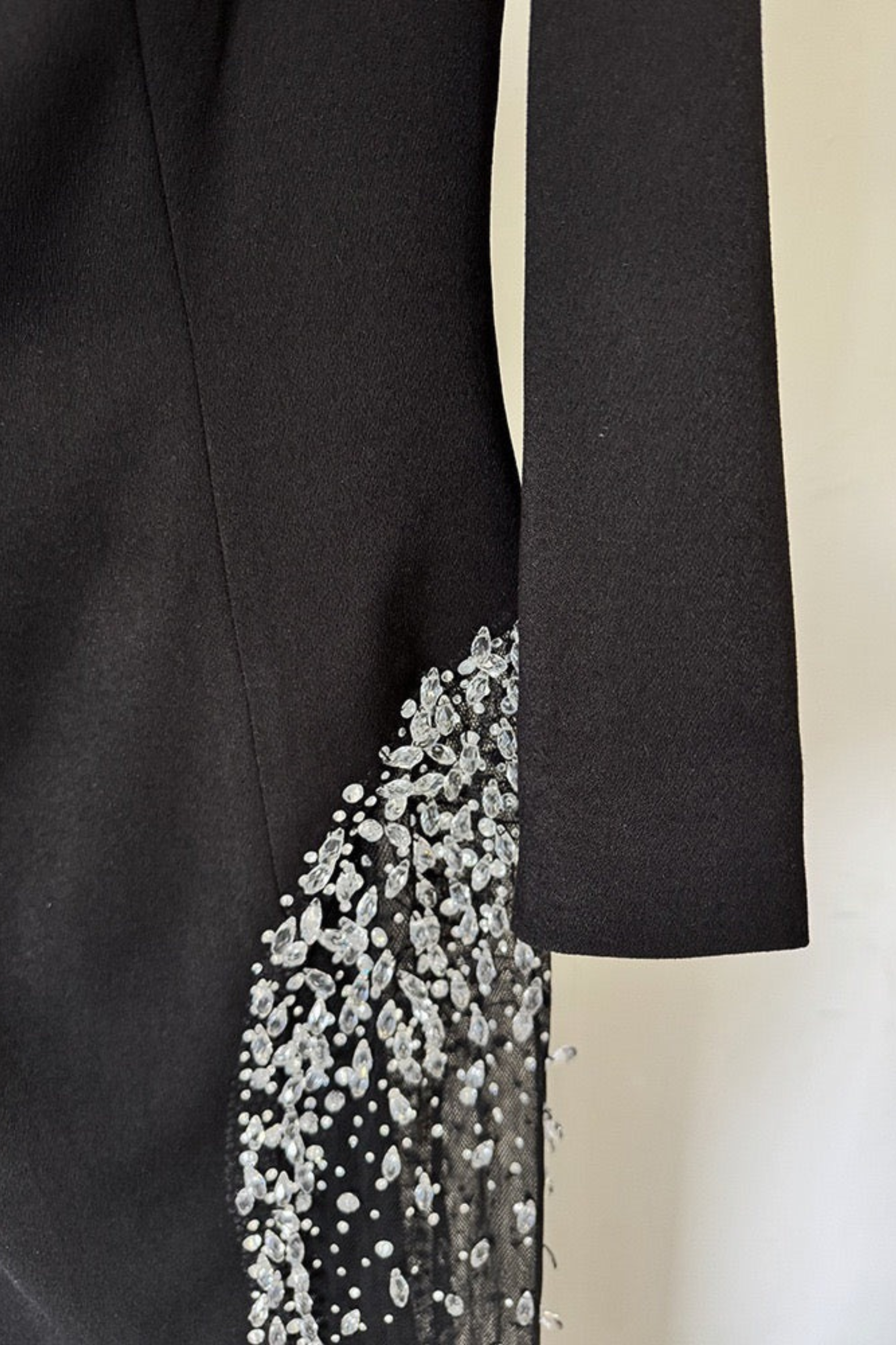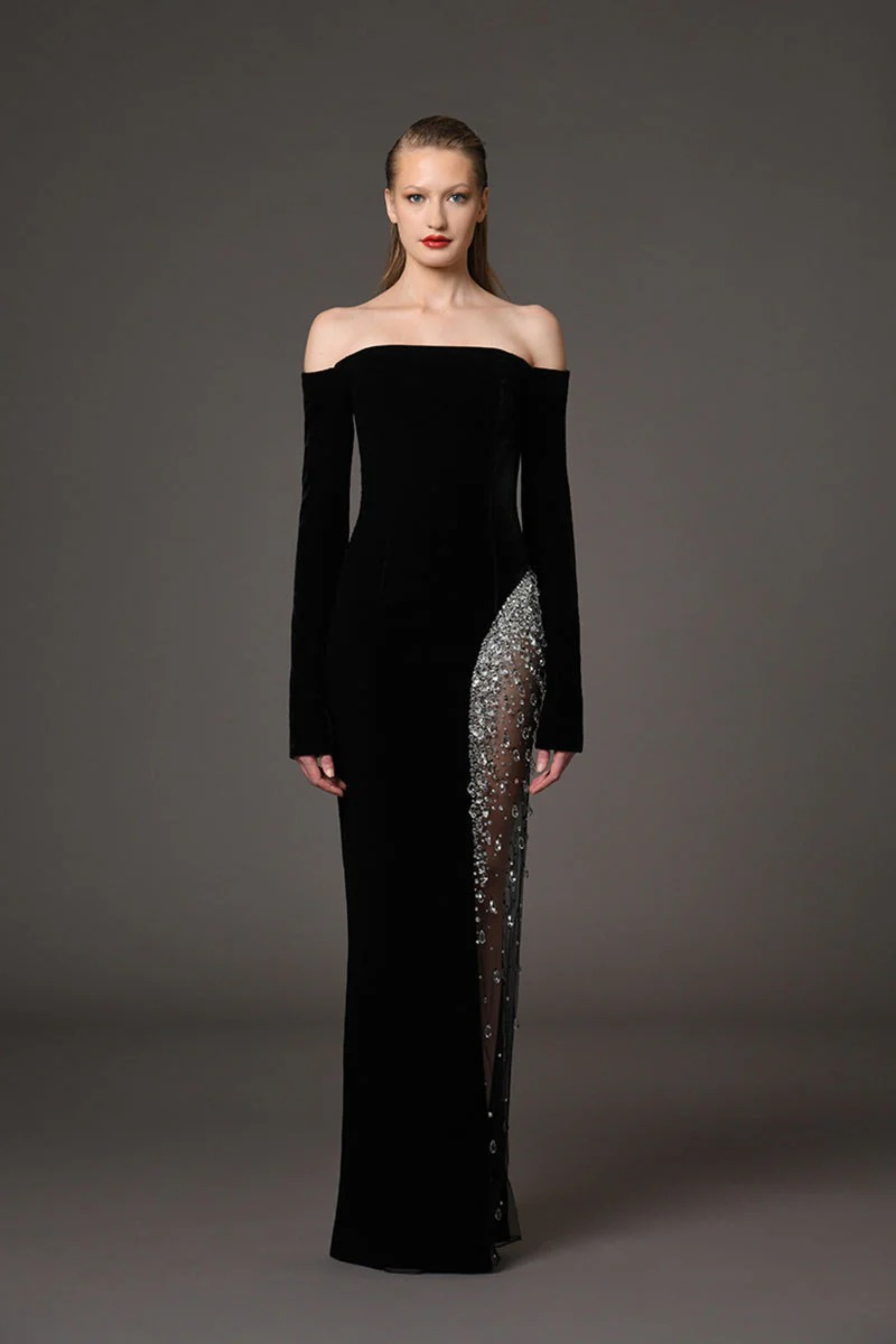 This striking long dress is designed in a luxurious black crepe blend, featuring an elegant off-shoulder neckline and long sleeves for a timeless silhouette. The highlight of the dress is its sheer side panel, intricately adorned with cascading crystal embellishments that add shimmer and drama to every step. With its structured fit and graceful floor-length cut, this long dress blends sophistication with modern glamour, perfect for red-carpet events, galas, or upscale soirées.