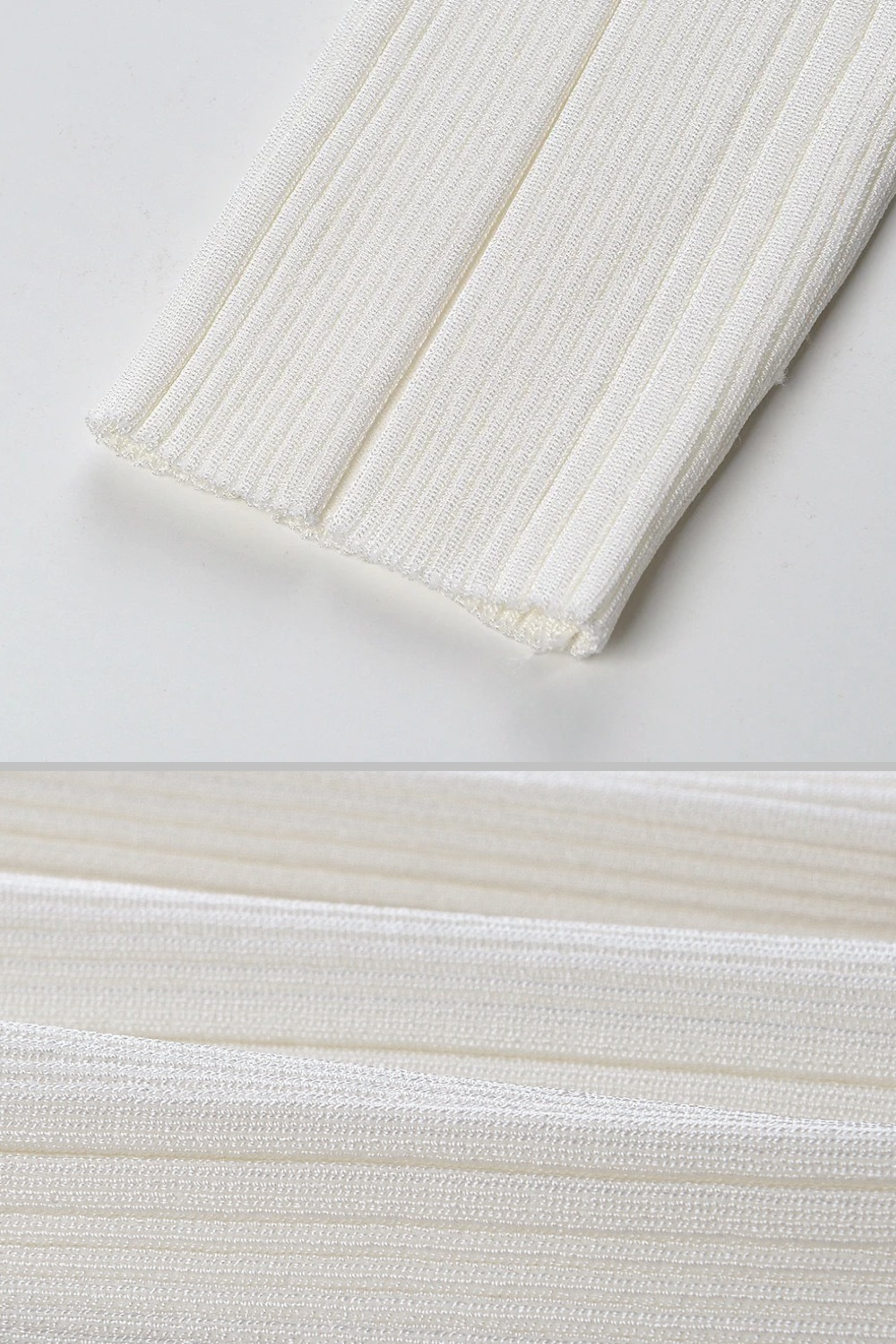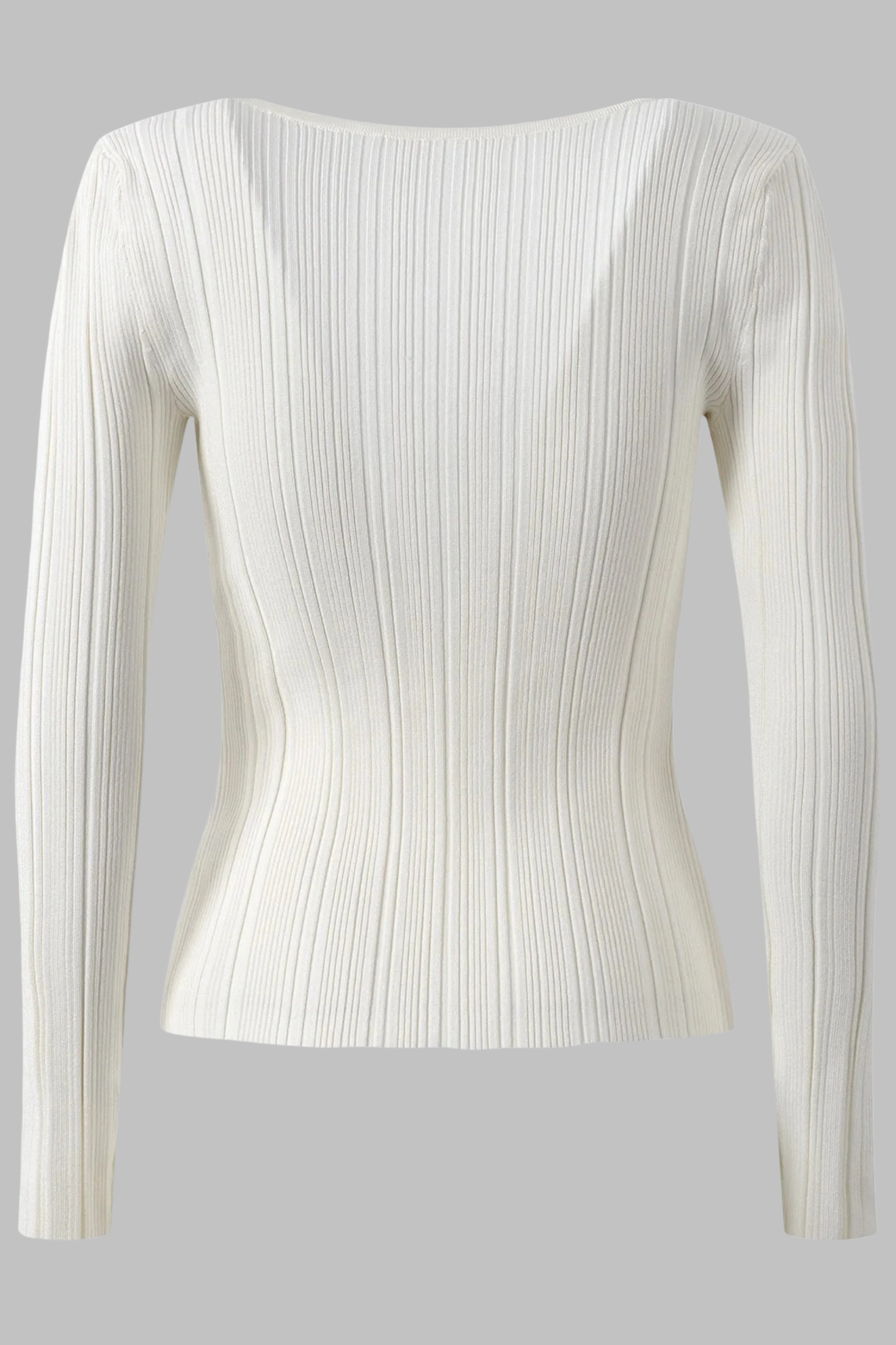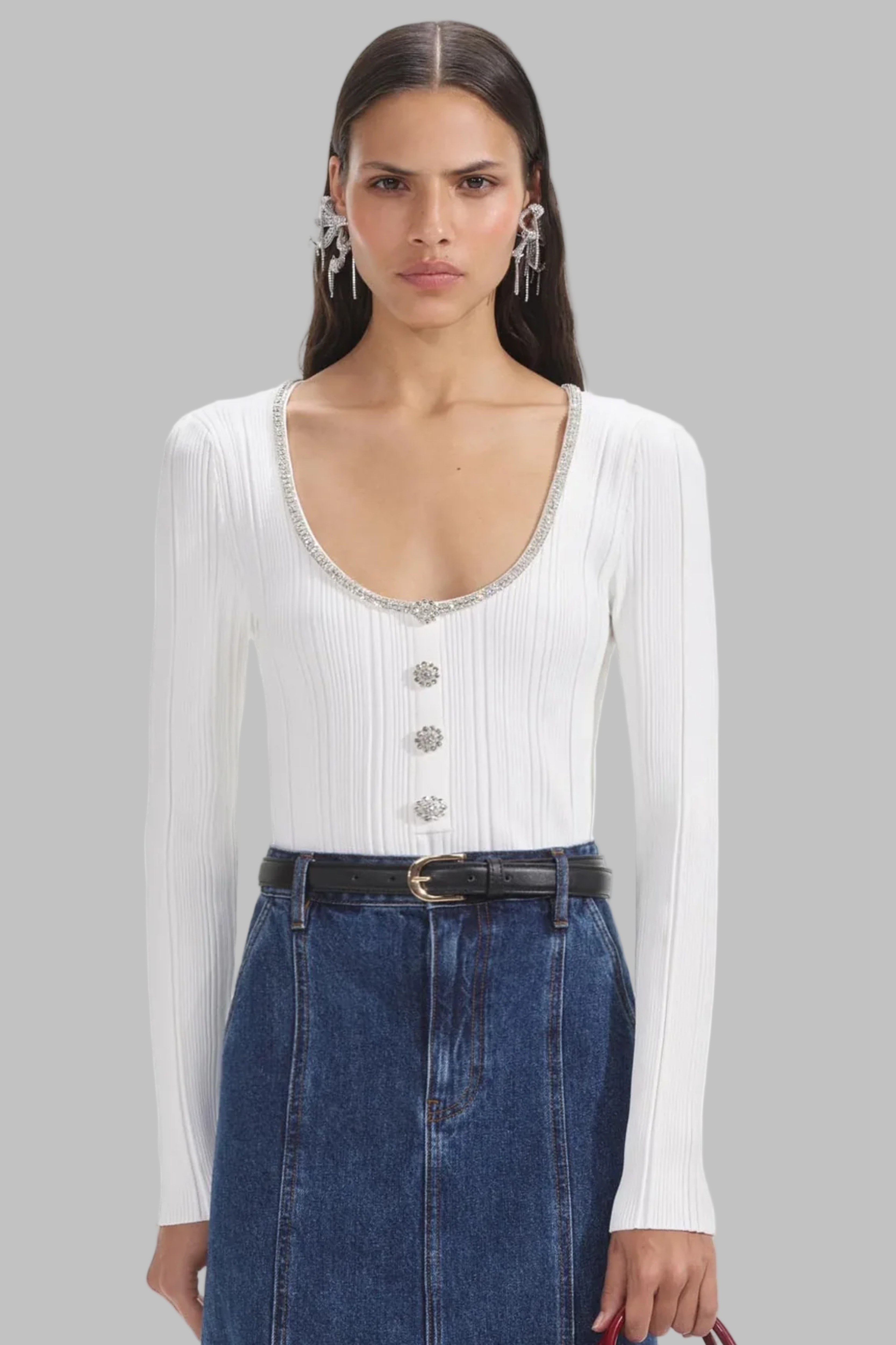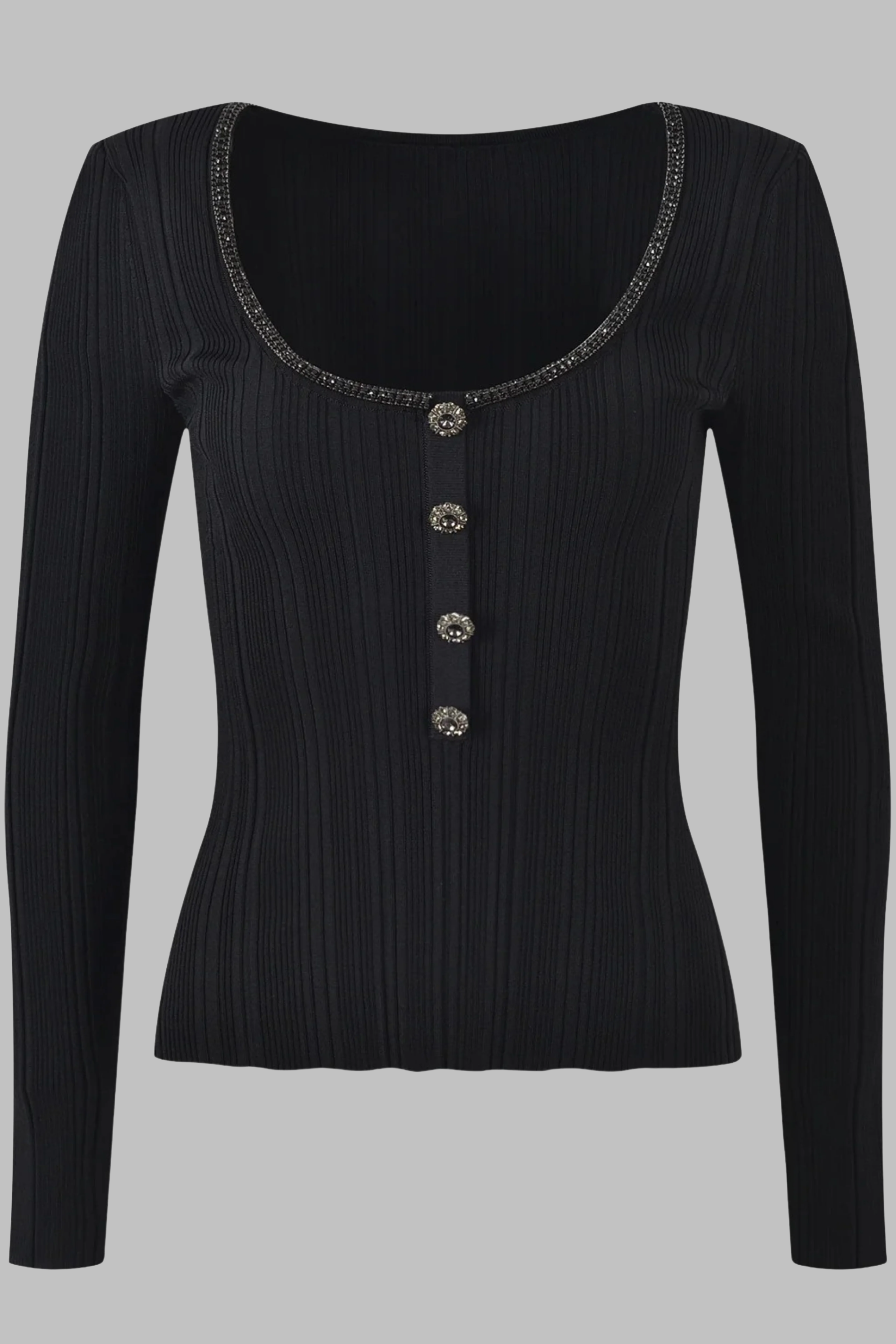 This ribbed knit top features a flattering U-neckline adorned with sparkling rhinestone trim and crystal buttons, combining elegance with modern detail. Designed in an elastic slim fit with long sleeves, it hugs the body comfortably while offering stretch and shape retention. Available in classic black and ivory white, making it a versatile piece for both casual chic and evening looks.