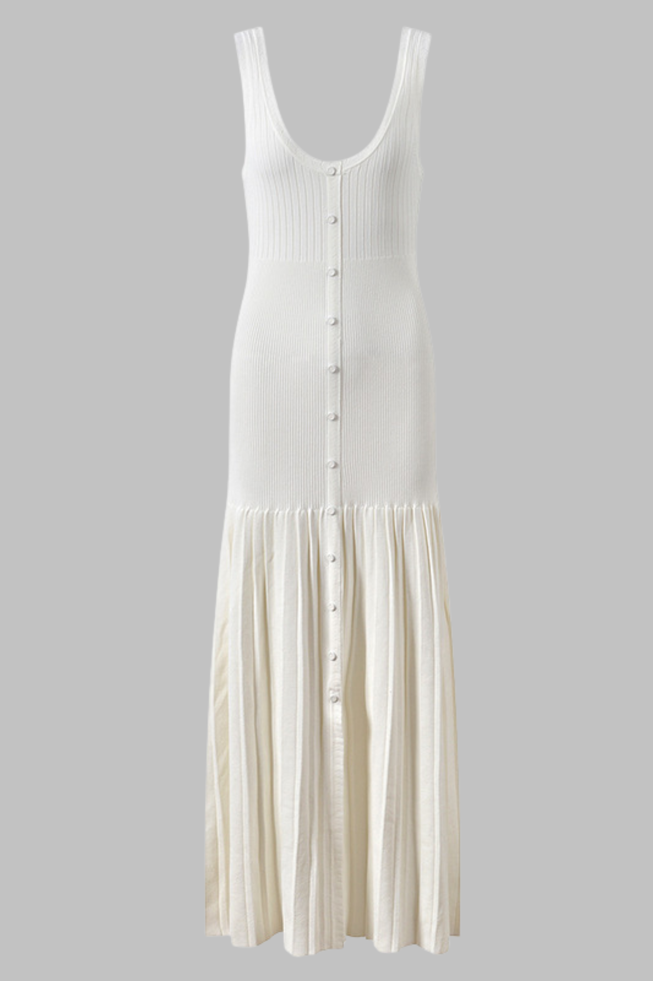 Elevate your summer wardrobe with this elegant sleeveless knit maxi dress. Featuring a flattering scoop neckline, ribbed bodice for a figure-hugging fit, and a soft flared hem for graceful movement, it exudes effortless sophistication. The button-front closure adds a refined touch, while the low scoop back offers a hint of allure. Crafted from a breathable, stretchy knit, it ensures both comfort and style for warm-weather days. Perfect for seaside strolls, casual gatherings, or layering with a light jacket for evening outings.