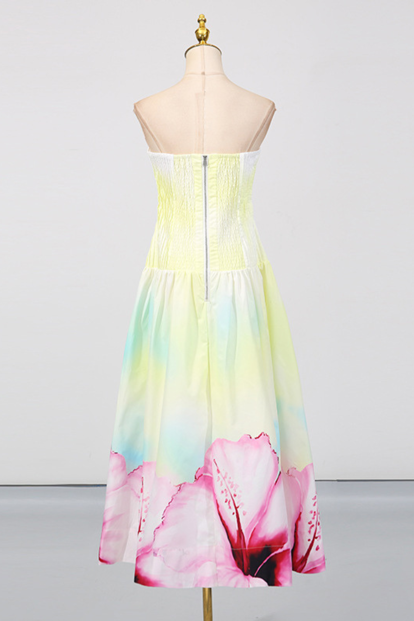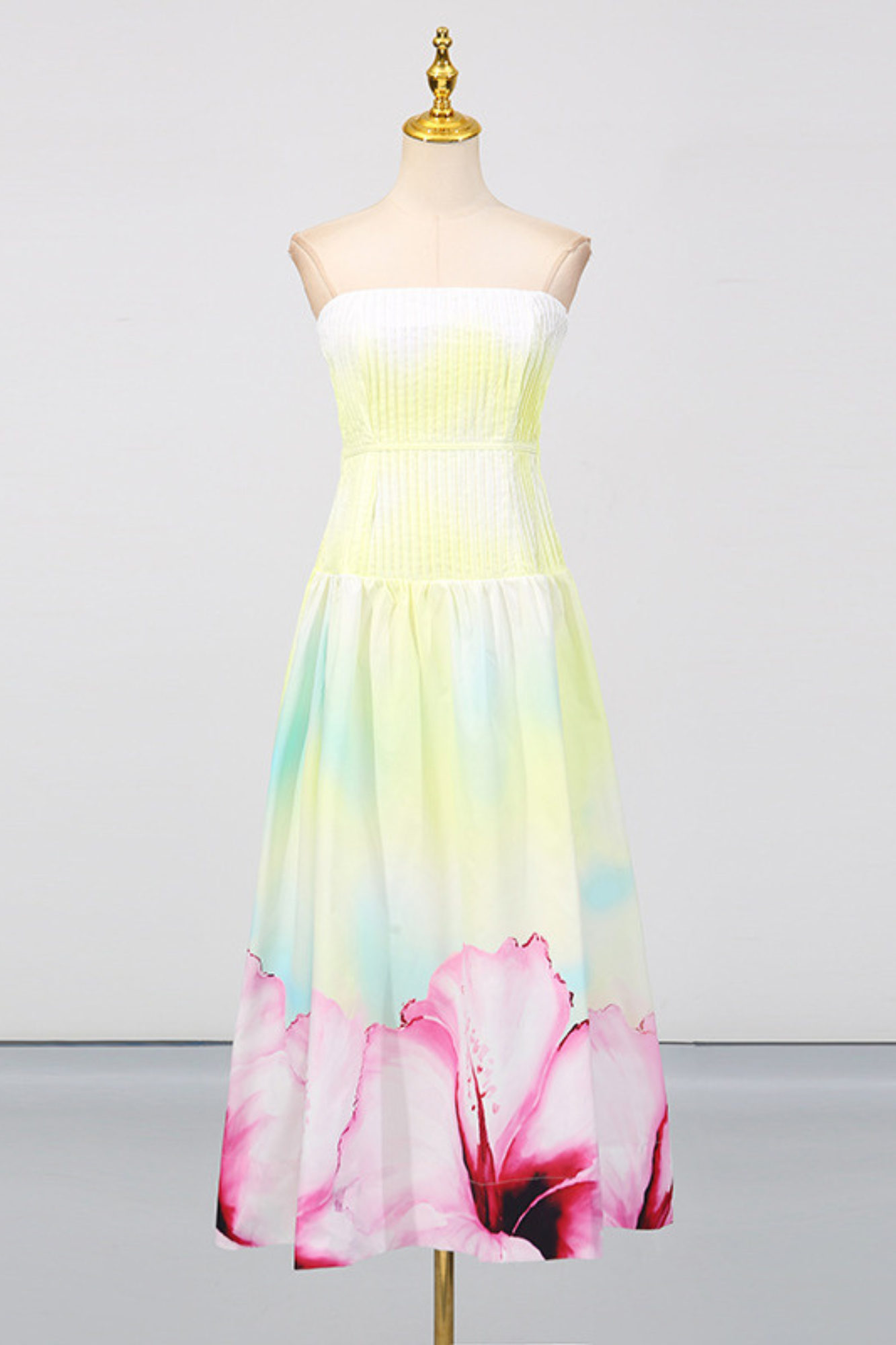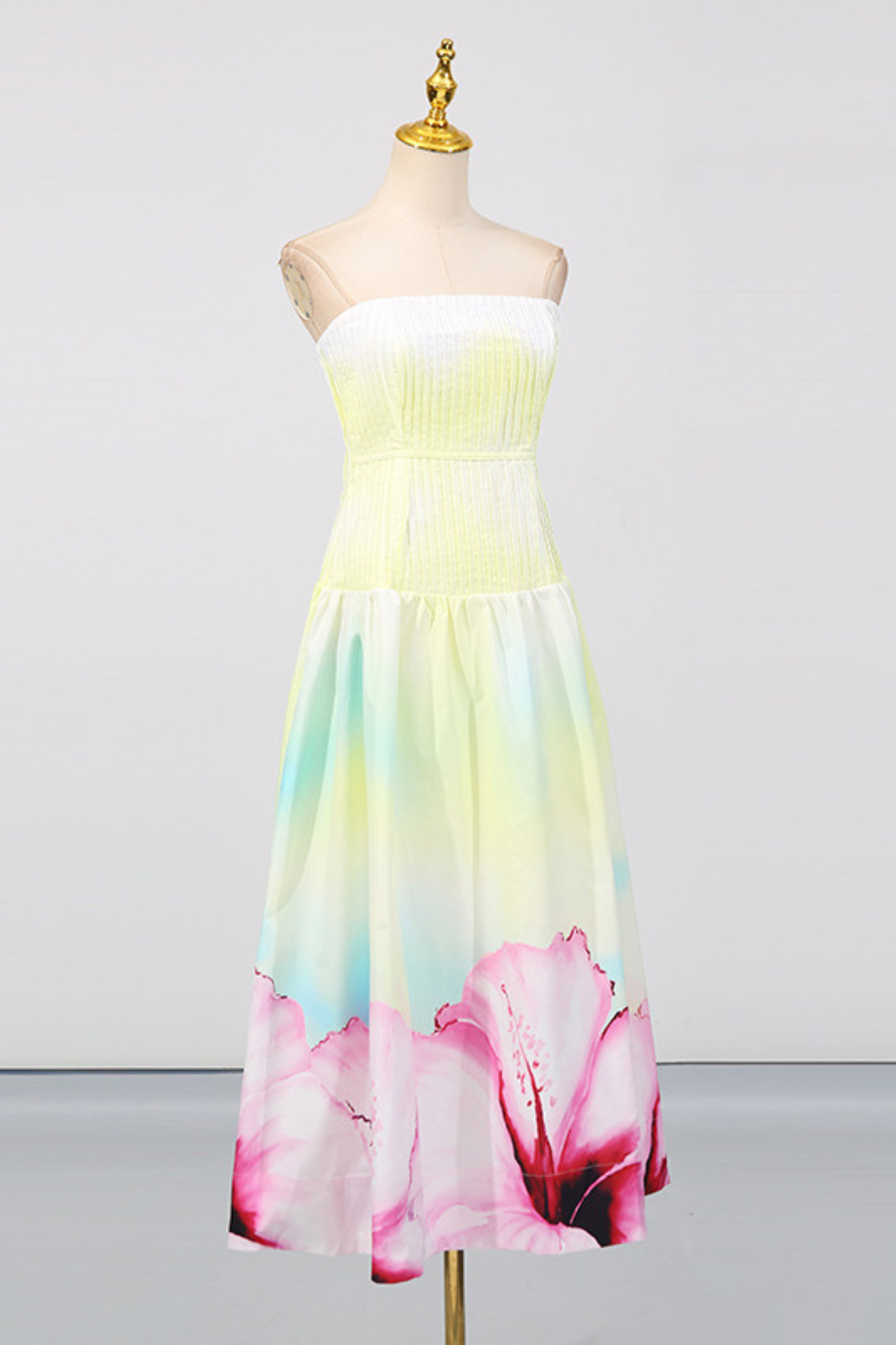 A dreamy strapless maxi dress featuring a pleated fitted bodice that flows into a soft, airy skirt. Designed in a gradient pastel yellow base with oversized floral prints in pink and purple along the hem, this piece radiates effortless elegance. The back zipper ensures a secure fit, while the strapless neckline highlights the shoulders for a refined, feminine silhouette. Perfect for summer evenings, garden parties, or seaside escapes.