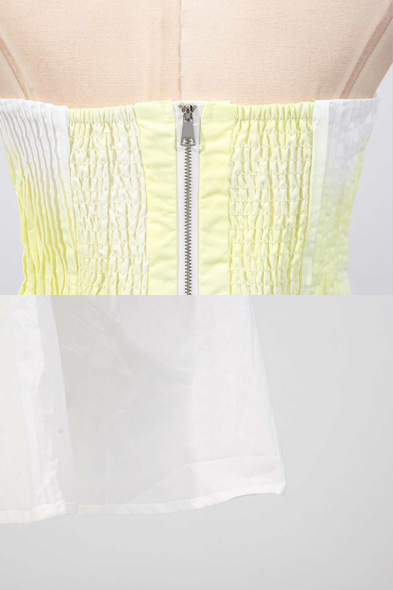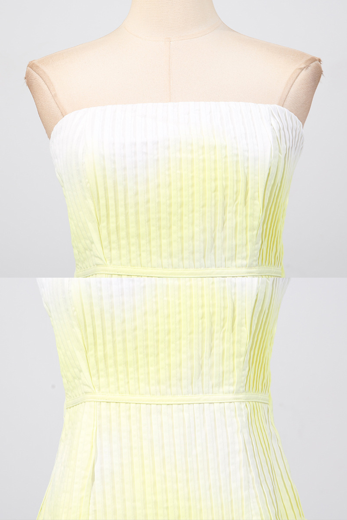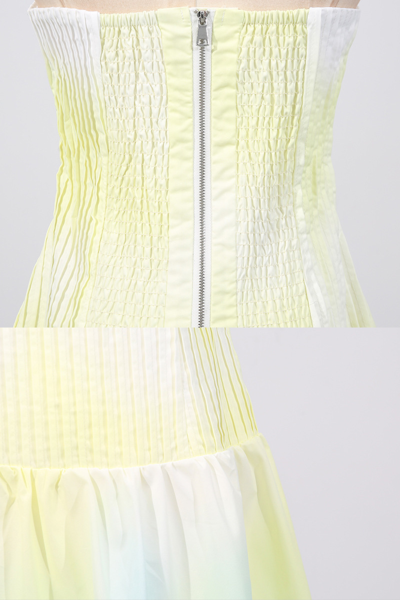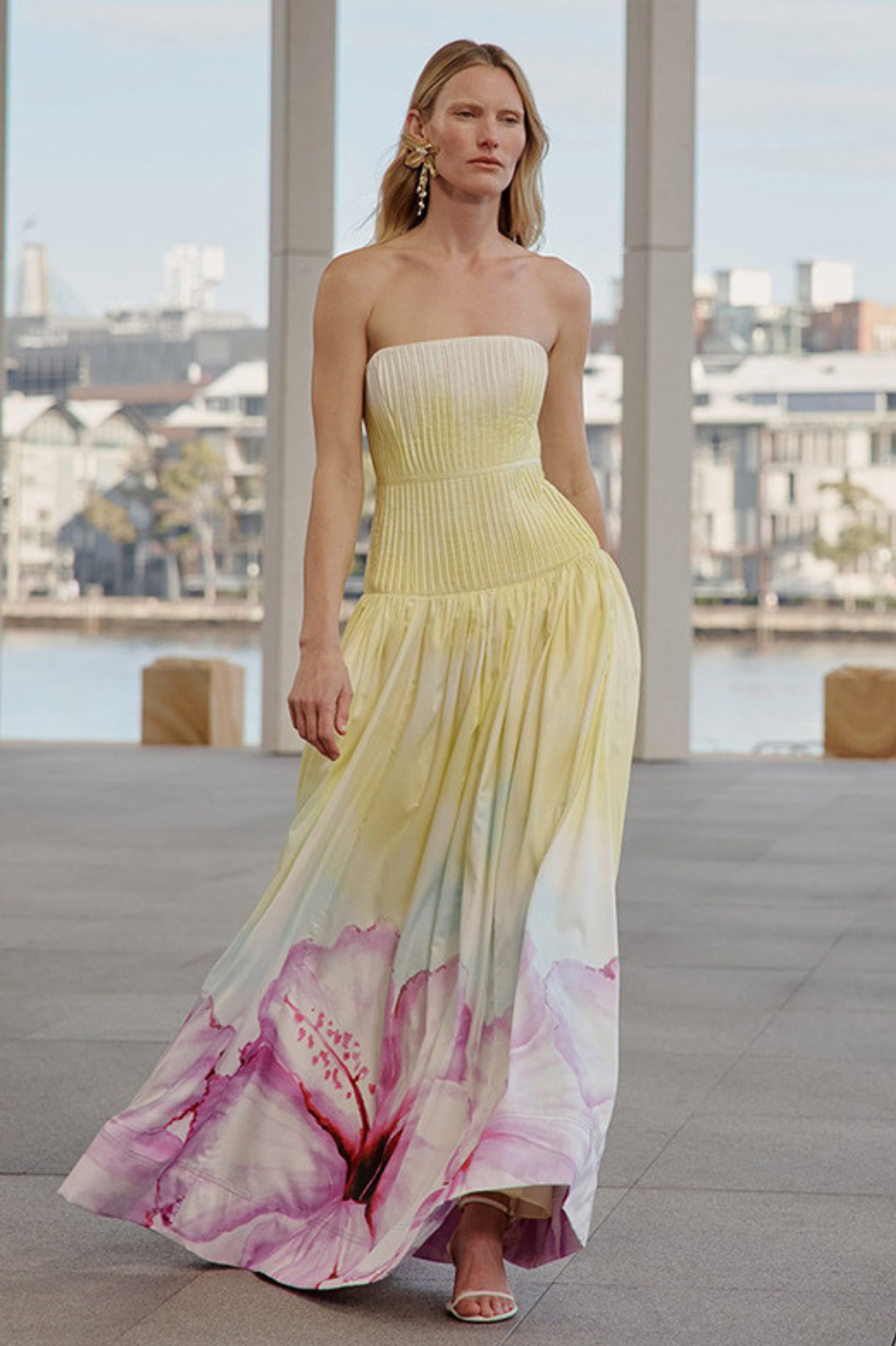 A dreamy strapless maxi dress featuring a pleated fitted bodice that flows into a soft, airy skirt. Designed in a gradient pastel yellow base with oversized floral prints in pink and purple along the hem, this piece radiates effortless elegance. The back zipper ensures a secure fit, while the strapless neckline highlights the shoulders for a refined, feminine silhouette. Perfect for summer evenings, garden parties, or seaside escapes.