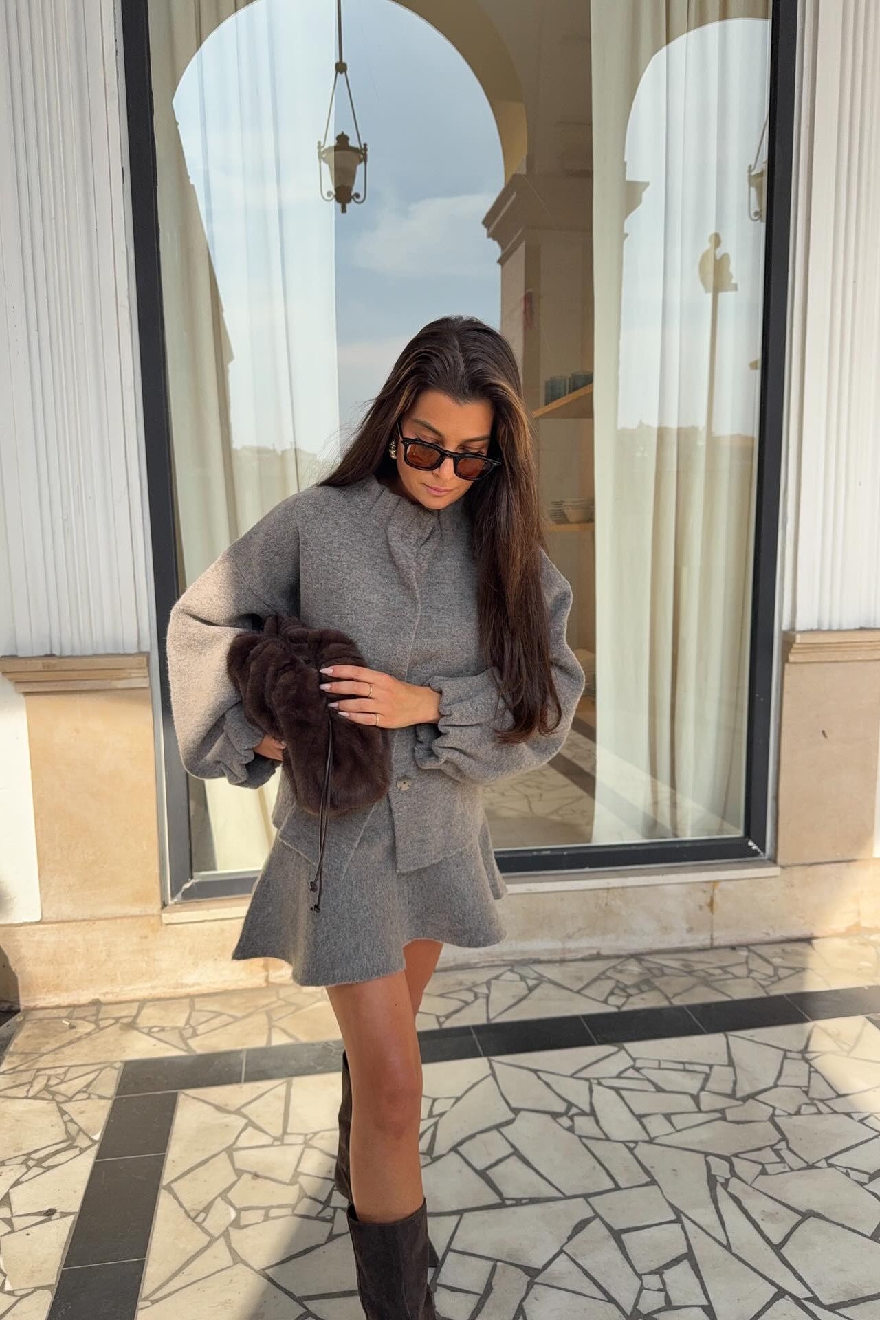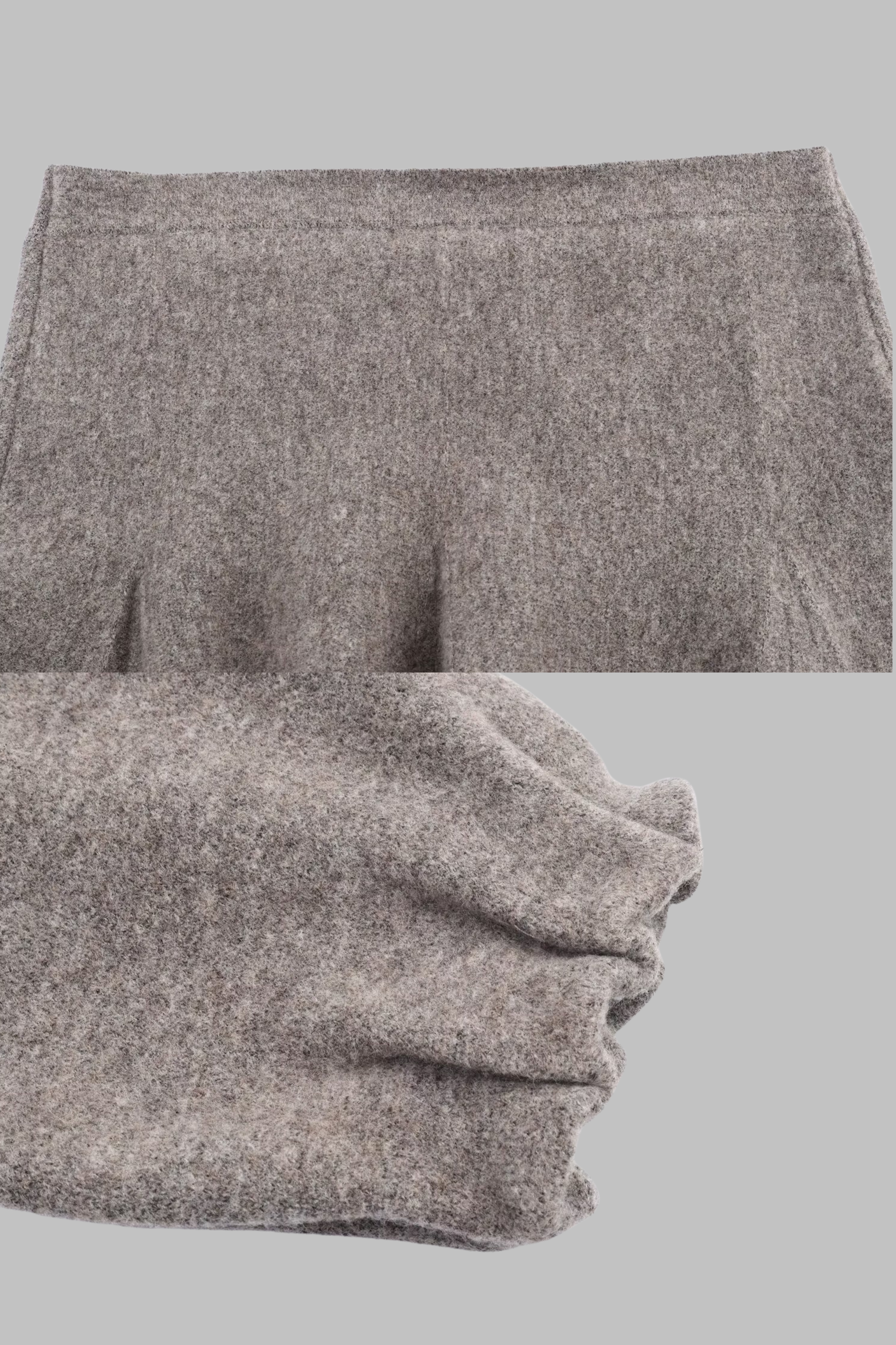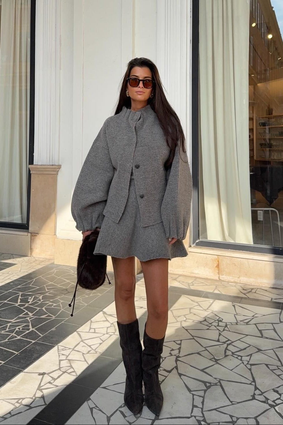A chic and cozy matching set crafted from a soft wool blend, perfect for cool-weather styling. The top features an elegant ruffled high neckline and voluminous balloon sleeves with gathered cuffs, adding a refined yet relaxed silhouette. The matching skirt sits high on the waist and falls into a gentle flared hem that flatters the legs with subtle movement. Together, they create a sophisticated, minimalist look that transitions effortlessly from casual daytime outings to refined evening wear.