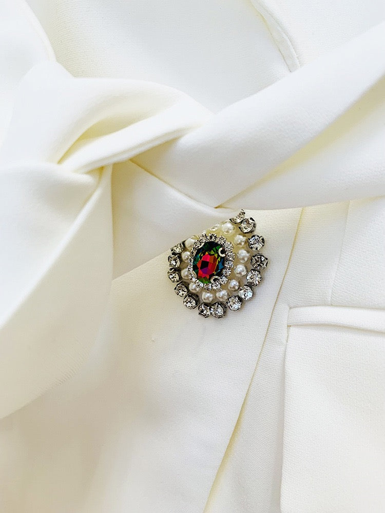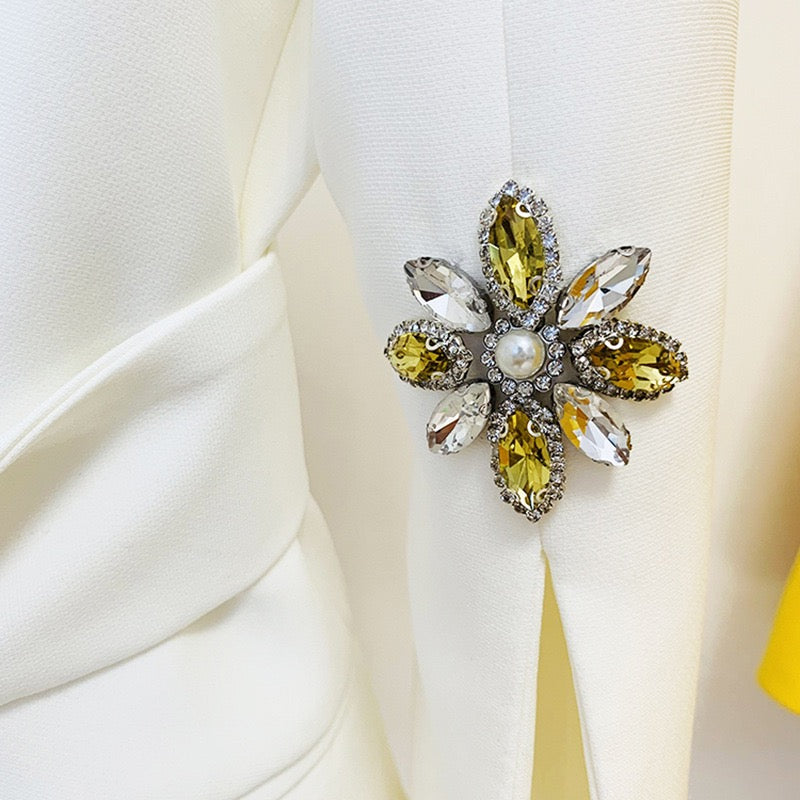 Elegant and refined, this white belted blazer combines classic tailoring with luxurious embellishment. Designed with a structured silhouette, notched lapels, and slit sleeves, it’s adorned with crystal and pearl floral brooches for a statement touch. The waist tie belt cinches the figure for a flattering fit, while the smooth crepe fabric ensures a polished, high-end look — perfect for formal occasions, evening events, or sophisticated daywear.
