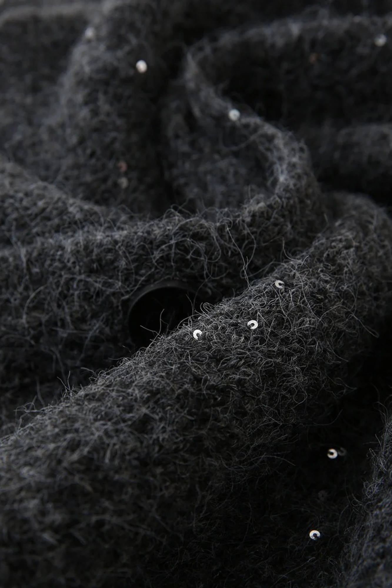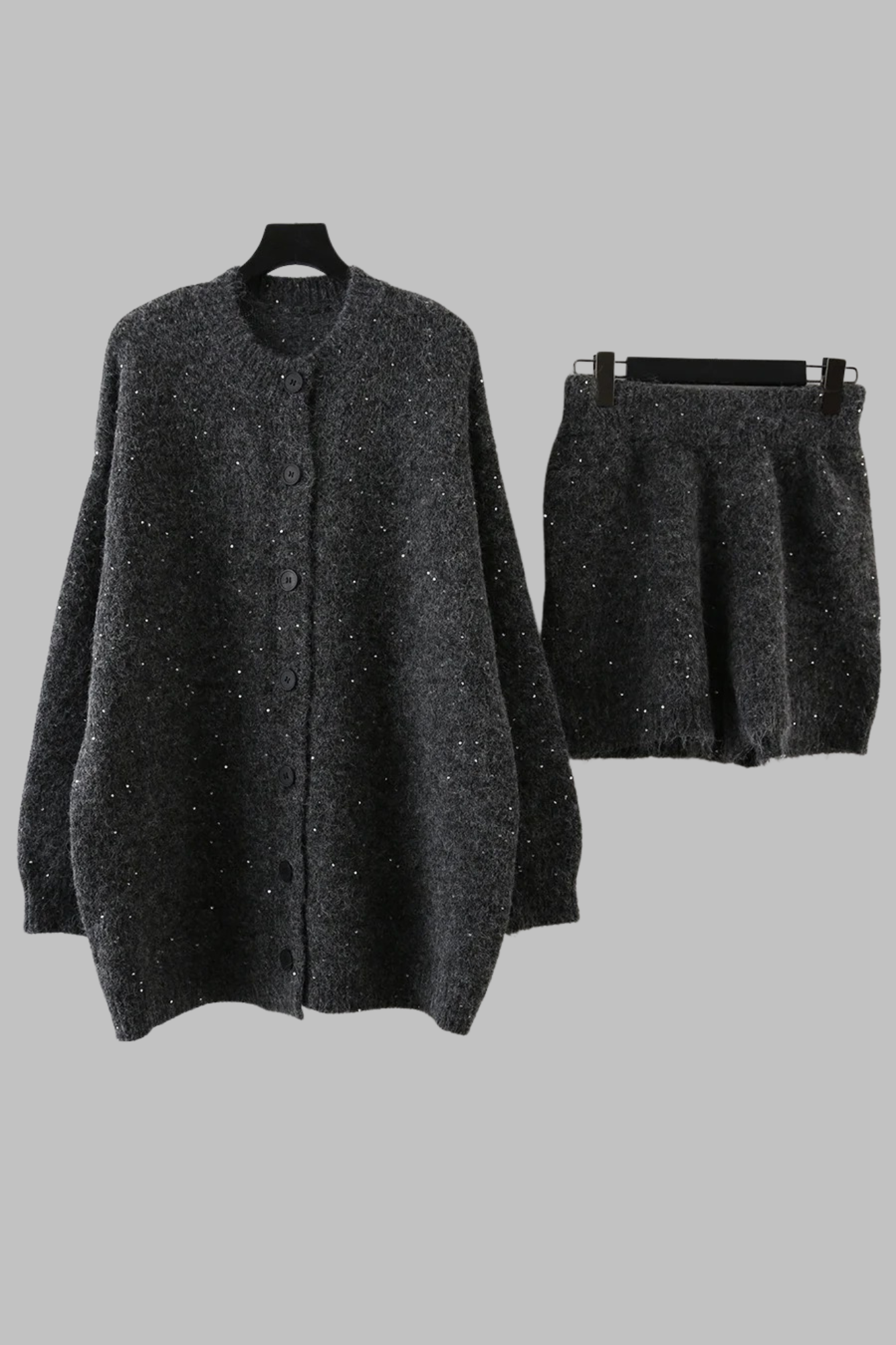 Add a touch of sparkle to your cozy days with this elegant wool knit two-piece set, featuring a soft oversized button-up cardigan and high-waist elastic shorts. Designed with delicate sequins woven into the wool fabric, it creates a gentle shimmer that catches the light while maintaining a warm, plush texture. Perfect for chic lounging, travel, or relaxed outings, this set blends comfort and glamour effortlessly. Available in ivory, charcoal grey, and black.